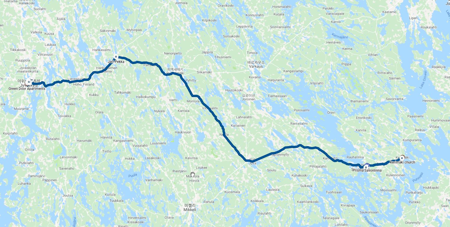 쿠오피오에 가려다가 벌써 시간이 12시 반이라 그냥 위베스킬라로 가기로 한다. 차 안에서 연어가 따끈할 때 먹었는데 맛있었다. 좀 달리다가 내가 운전을 한다. 음악을 들으며 달린다. 지형이 약간 시골길로 바뀌면서 속도 단속 카메라도 잘 안보이고 굽이굽이 길이 펼쳐진 마을이 나타난다. 수영할 수 있는 호수에 온다. 믈이 깨끗하지는 않다. 쉼터에서 연어와 과일을 먹는다. 화장실이 완전 푸세식으로 아래의 모든 것이 다 보여서 충격적이다. 핀란드는 진정 아시아 인가보다. 한참 달리다가 주유를 했다. 이 차는 연비가 좋다. 다시 왼쪽으로 꺾어 많은 차들이 줄을 지어 천천히 달린다. 금요일이어서 그런지 차들이 많다. 위베스킬라는 꽤 복잡한 도시인가 보다. 흐름이 느리다.