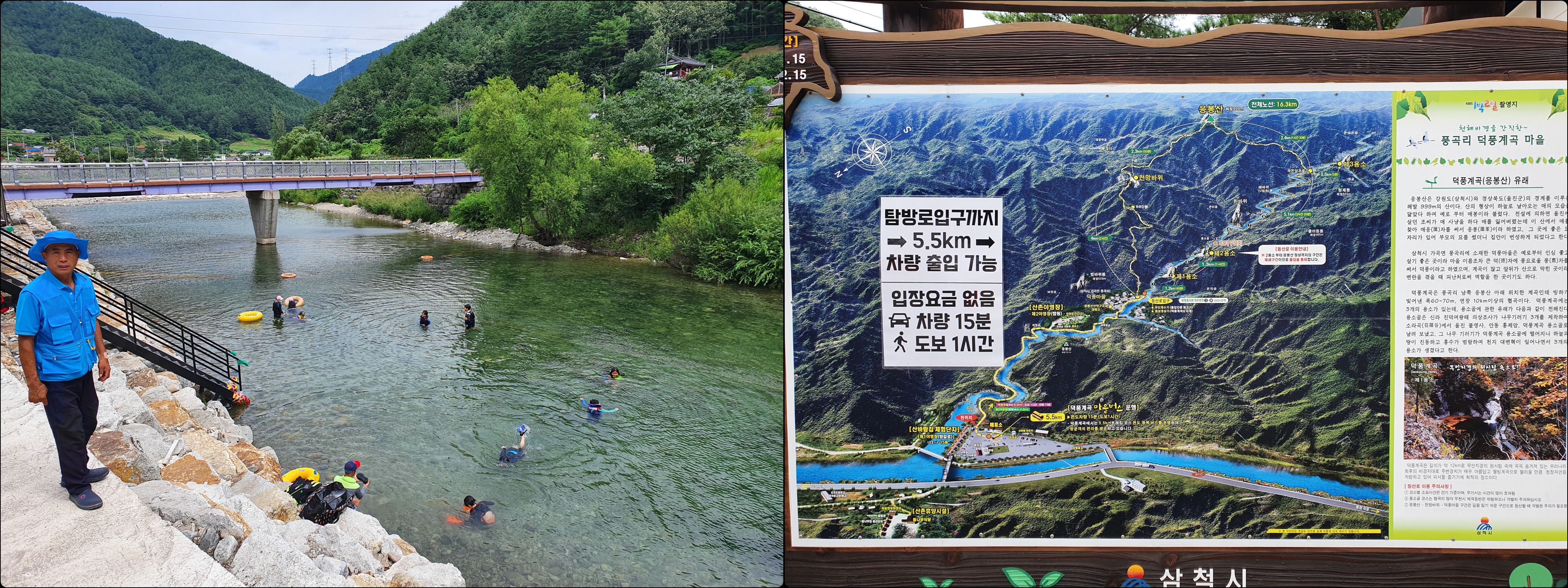 덕풍계곡 진입하여 한 200여미터 지난 곳에 쉴만한 소 하나가 있고 1용소까지 가는 길에도 여러 군데 물에 들어갈 곳이 있다.