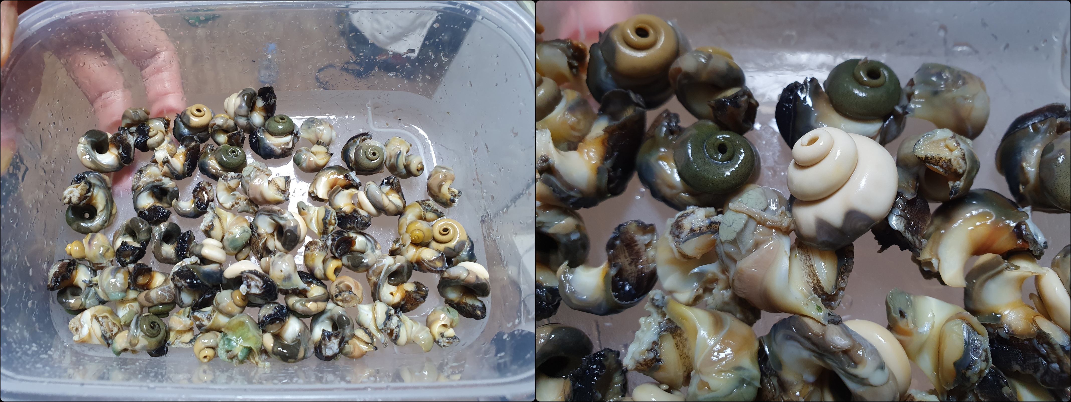 작년 추석 계곡 여행 중 들른 갈남항. 그때는 그렇게 복잡하지 않았는데 오늘은 주차장이 엄청나게 넓은데도 거의 모든 주차면이 만차다. 여러 사람들이 스노클링을 많이 하는 항내는 시계가 안 좋다. 두어 번 돌다 작년에 스노클했던 항 바깥쪽으로 가니 과연 물이 맑다. 우리는 고둥을 잡느라 한참동안 정신 못 차리고 재밌어 했다. 비닐봉지에 잡은 고둥을 담았다가 래시가드 안에 넣어둔다. 물은 엄청 맑고 물고기들도 많다. 고프로로 수중촬영해 보니 색이 찬란하여 찍을 맛이 난다. 제주도나 강원 고성 지역 능가하도록 갈남항 물이 정말 맑았다. 시간이 훌쩍 가서 5시다. 손이 점점 추워져서 감각이 없어 지려고 한다. 경아씨는 여전히 더 있을 수 있다고 하지만 재촉하여 나왔다. 잡은 고둥은 두손 가득 정도?