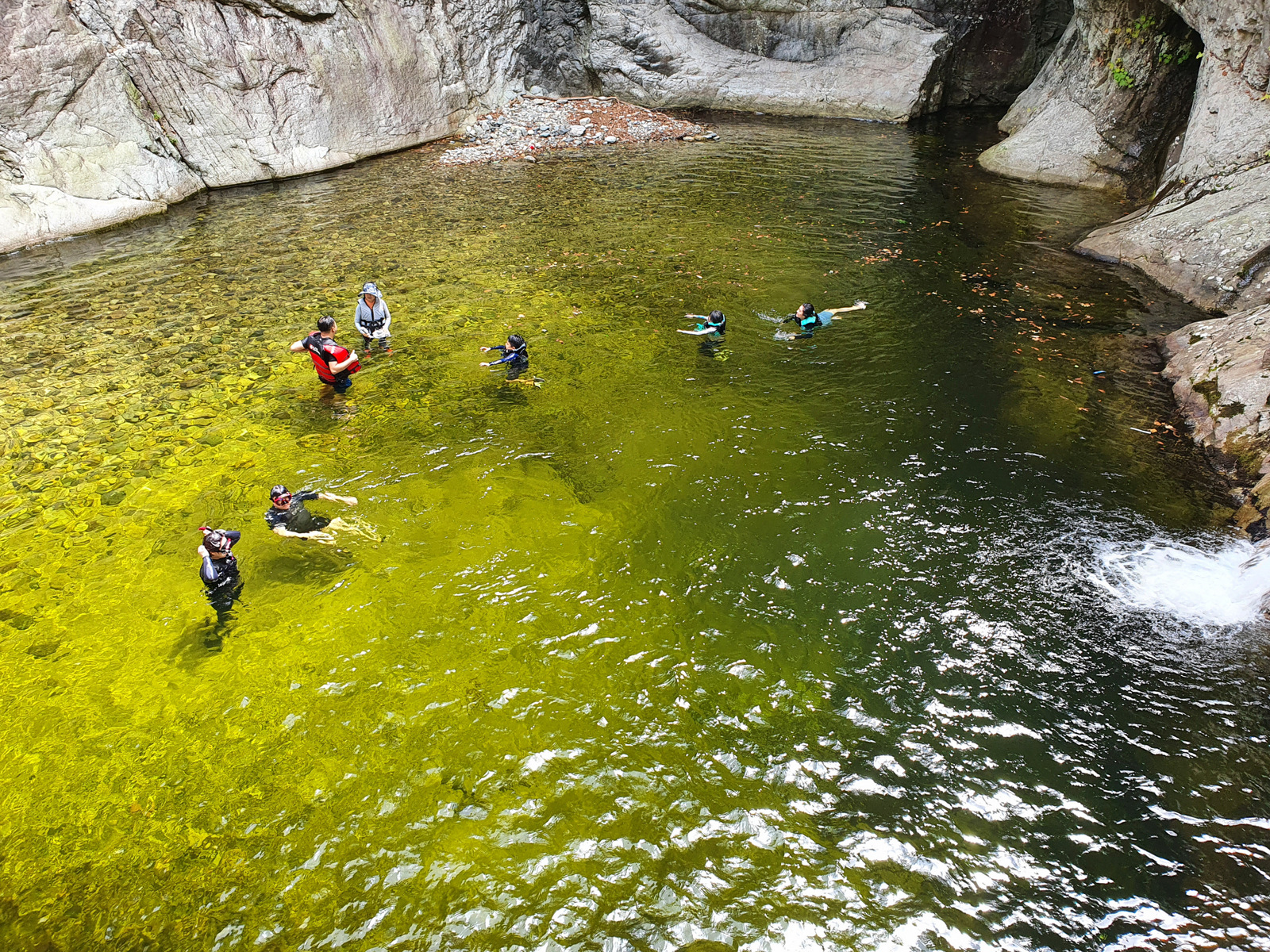 1용소에 도착했다. 올라갈 땐 넓고 깊어 보이고 사람들이 충분히 놀 만 하다 싶었는데, 막상 들어가 보니 깊은 곳은 넓지 않았고 대부분 얕았다. 수온도 많이 높고 부유물도 많다. 적당히 돌다 나왔다.