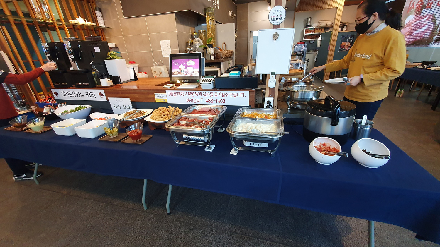아침 먹으러 7시 반에 내려갔다 건물에 있는 식당과 제휴하여 한식 부페 형식으로 푸짐하게 차려 놓아서 놀라웠다. 아주 고급 호텔 뷔페식 아침 모습이다. 계란도 맘대로 부쳐 먹고 라면도 맘대로 끓여 먹는다. 볶음밥과 잡채, 불고기, 찌개, 소시지, 탕수육, 햄 등등이 준비되어 있어서 일단 맛보려 조금씩 덜어왔다. 볶음밥은 간이 잘 맞았고 잡채가 꽤 맛있었고 불고기도 맛있었지만 나머지 음식들은 냉동식품을 데워놓은듯 퍽퍽 했다. 구색만 멋지게 맞춰놓은 느낌? 한 접시 맛보기로 먹고 조금만 더 덜어와서 먹고 나왔다. 하지만 오전 내내 목이 마르는 기분 나쁜 느낌이 있었다.