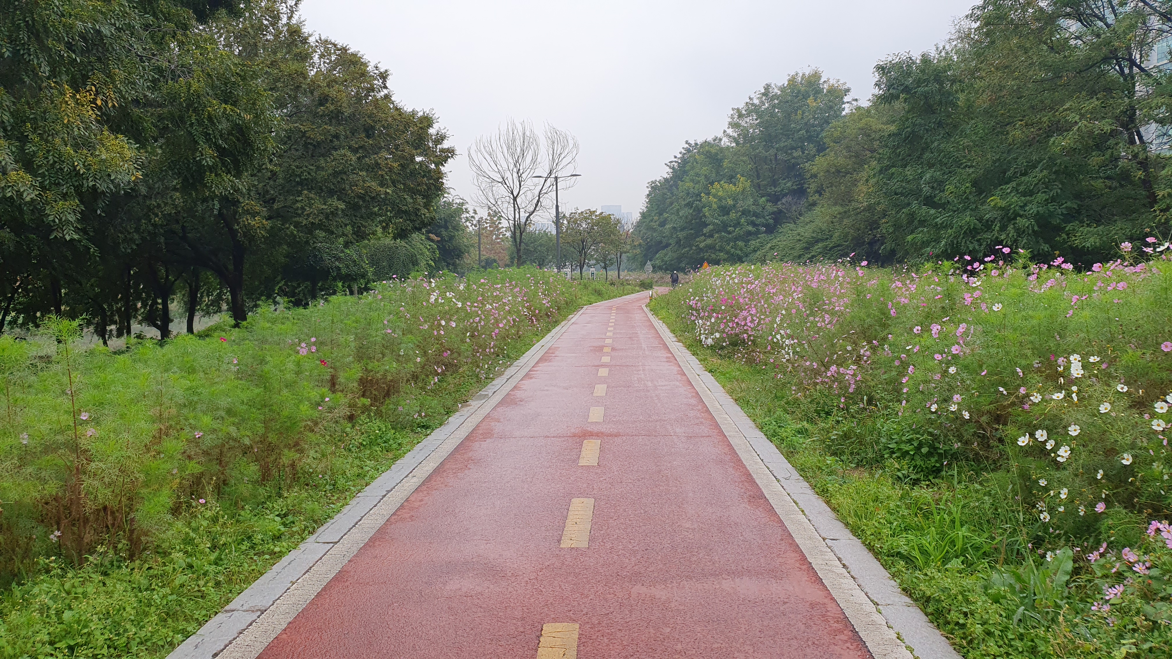 돌아오는 길 광명구간을 강동 구간으로 왔다. 선유도역 부근에서 도보길은 숲으로, 자전거길은 길 가 코스모스로 단장된 코스가 너무나 아름다워 마치 놀이공원에서 레일바이크를 모는 것 같았다. 송지호, 화진포 둘레길 이후 최고의 코스다.