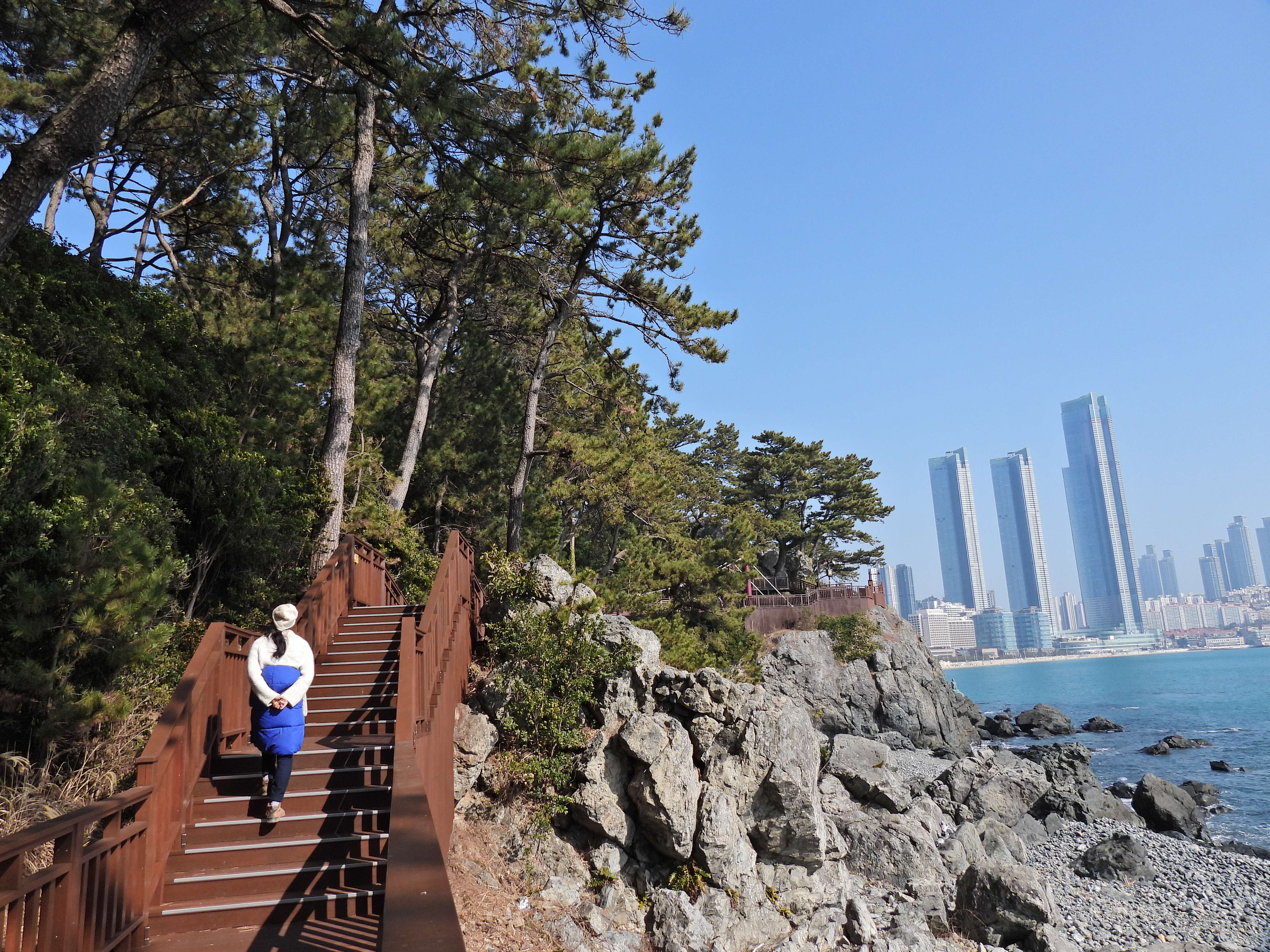해운대 광장 공영주차장을 목적지로 삼고 가 봤는데 해운대 전체가 아주 복잡하게 북적북적댄다. 그냥 나가려다가 동백섬 공영주차장에 차를 세웠다. 이곳 주차비는 10분당 300원. 경차이므로 50% 할인된다. 딱 한 대 남았다. 동백섬 가운데 최치원 동상까지 올라갔다가 내려와서 조선비치 호텔 방면으로 해안 둘레길을 걷고 돌아왔다. 둘레길이 아주 잘 마련되어 있다.