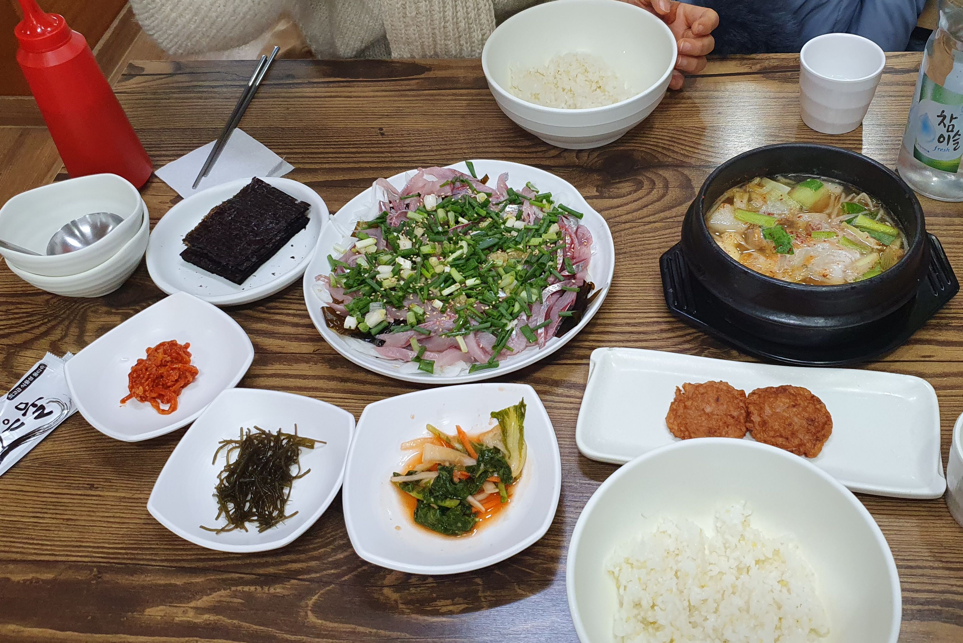 그냥 포기하고 바다 실비 식당으로 향했다. 마창대교를 지나는 탁 트인 길이다. 실비 식당은 길가에 위치에 있어 주차장은 없다. 대신 뒷골목에 주차할 곳이 좀 있다. 모둠회 소짜(25천원) 시키고 매운탕(5천원) 도 시켰다. 밑반찬 몇 가지가 먼저 나왔다. 묵은지가 꽤 품위 있다. 양념장은 된장기반인데 꽤 맛스럽다. 조금 있다 모둠회가 나왔는데 피쉬케이크라 부를 정도로 수북히 쌓았다. 한참 동안 배불리 먹었는데 절반 정도 남았다. 매운탕은 큰 냄비에 나왔다. 아주 담백했고 산초 향이 살짝 풍겼다. 매운탕 들어 있는 생선살과 내장들이 정말 싱싱했다. 든든하게 배불리 먹고 절반 정도 남은 회와 쌈장 등등을 싸왔다. 이것만으로 거의 도시락 하나다.