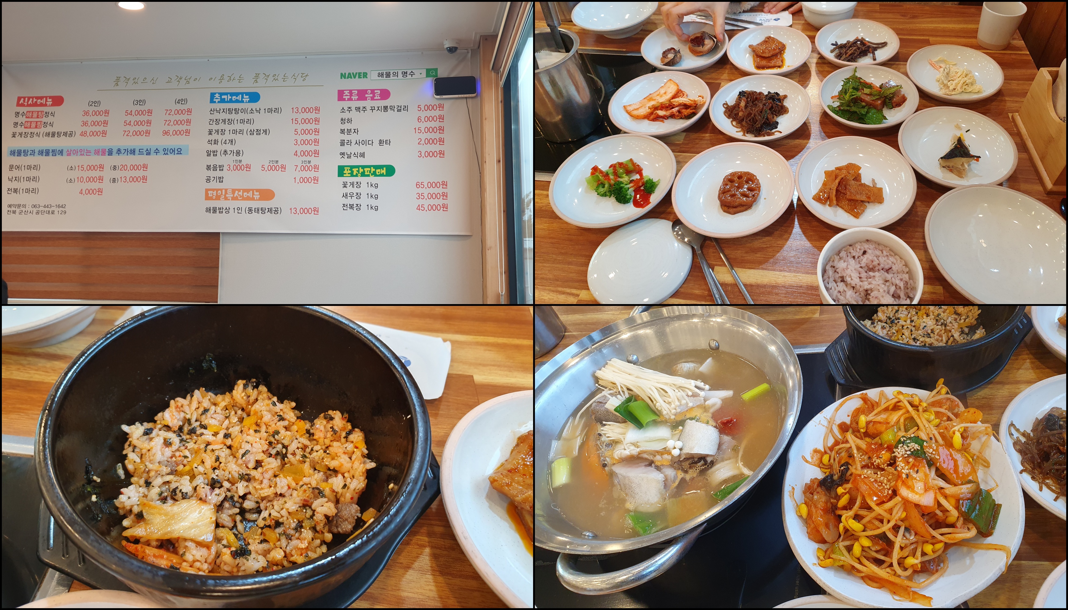 해물의 명수에서 해물밥상 1인 13,000원 2인분 먹었다. 동태탕과 약간의 해물찜 여러 가지 반찬들이 나온다. 피조개도 나오고 동태탕 안에도 조개, 해물찜에도 조개가 들어 있다. 배불리 잘 먹었지만 다음에 굳이 찾아올 집은 아닌 것 같다.