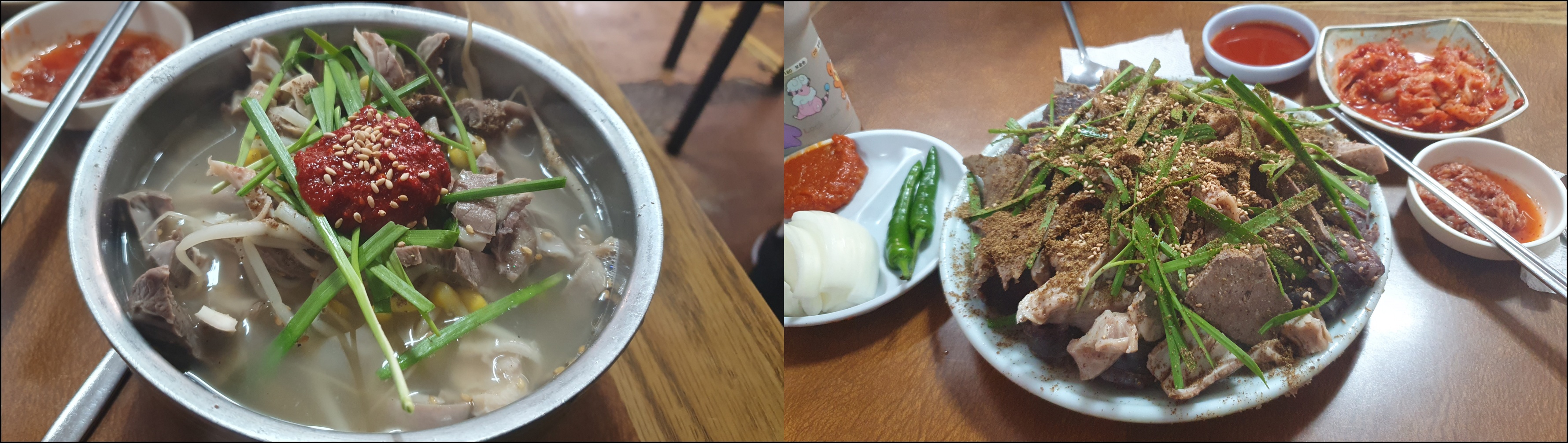 점심은 대인시장의 나주식당. 국밥 시키면 엄청난 순대와 머리 고기를 서비스로 내주는 집이다. 국밥 보통 3개를 시키니 한 접시 그득 순대와 머리 고기가 나왔다. 한참 동안 먹다 보니 국밥이 나왔는데 국밥 안에도 고기가 가득. 역시나 혜자로운 집답게 젊은 커플들도 많이 와서 대기하고 있었다. 거의 3인분 고기를 남겨서 포장해 왔다. 해안이 집에서 뻗었다.