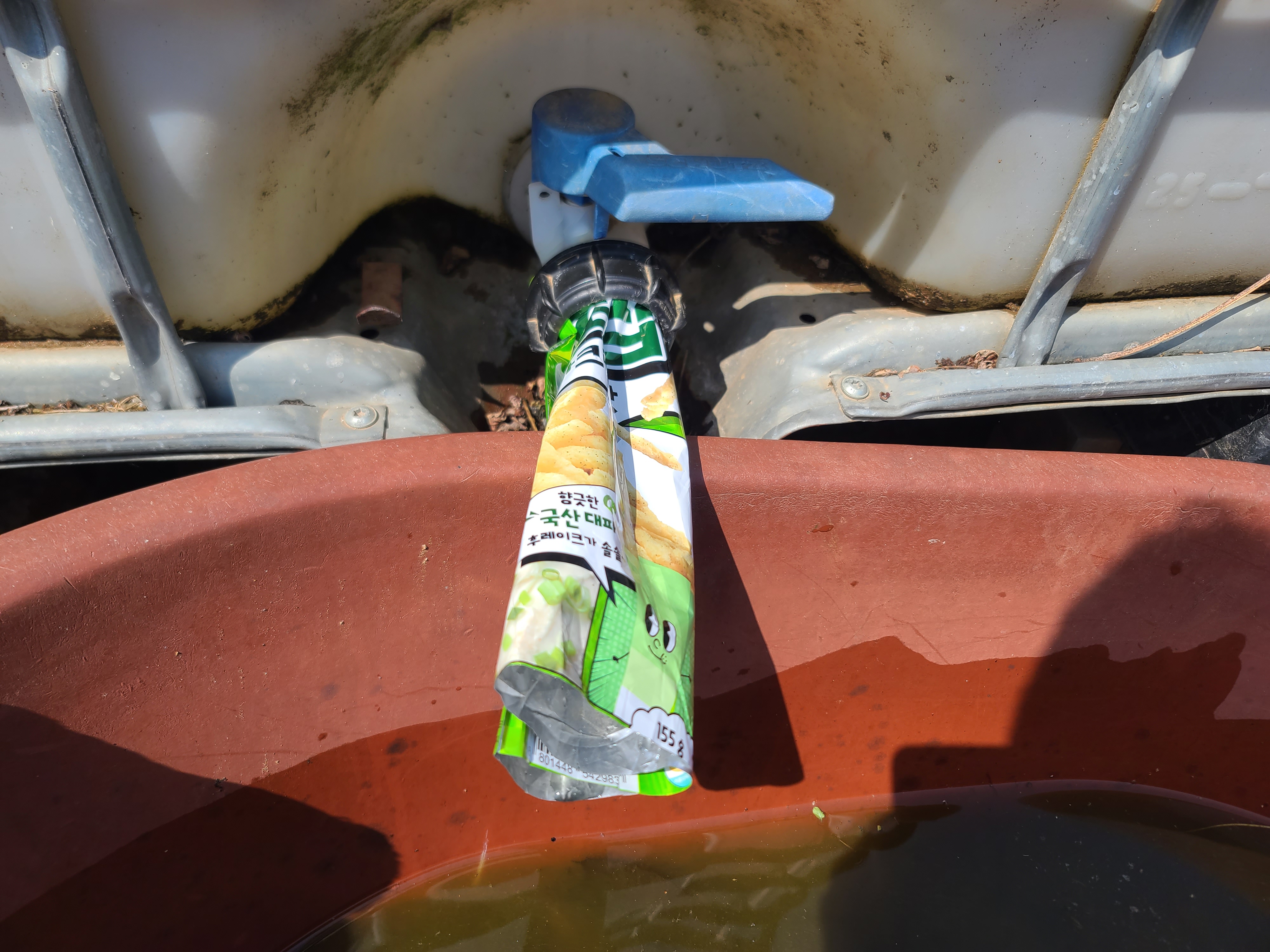텃밭의 1t 물탱크 꼭지가 부서져 찾기를 여러 달. (알고 보니 이런 제품이 있었네) 오늘 간단하게 해결. 과자봉지를 호스처럼 감싸고 원래 꼭지를 고정했던 마개로 꽉 조이니 끝.