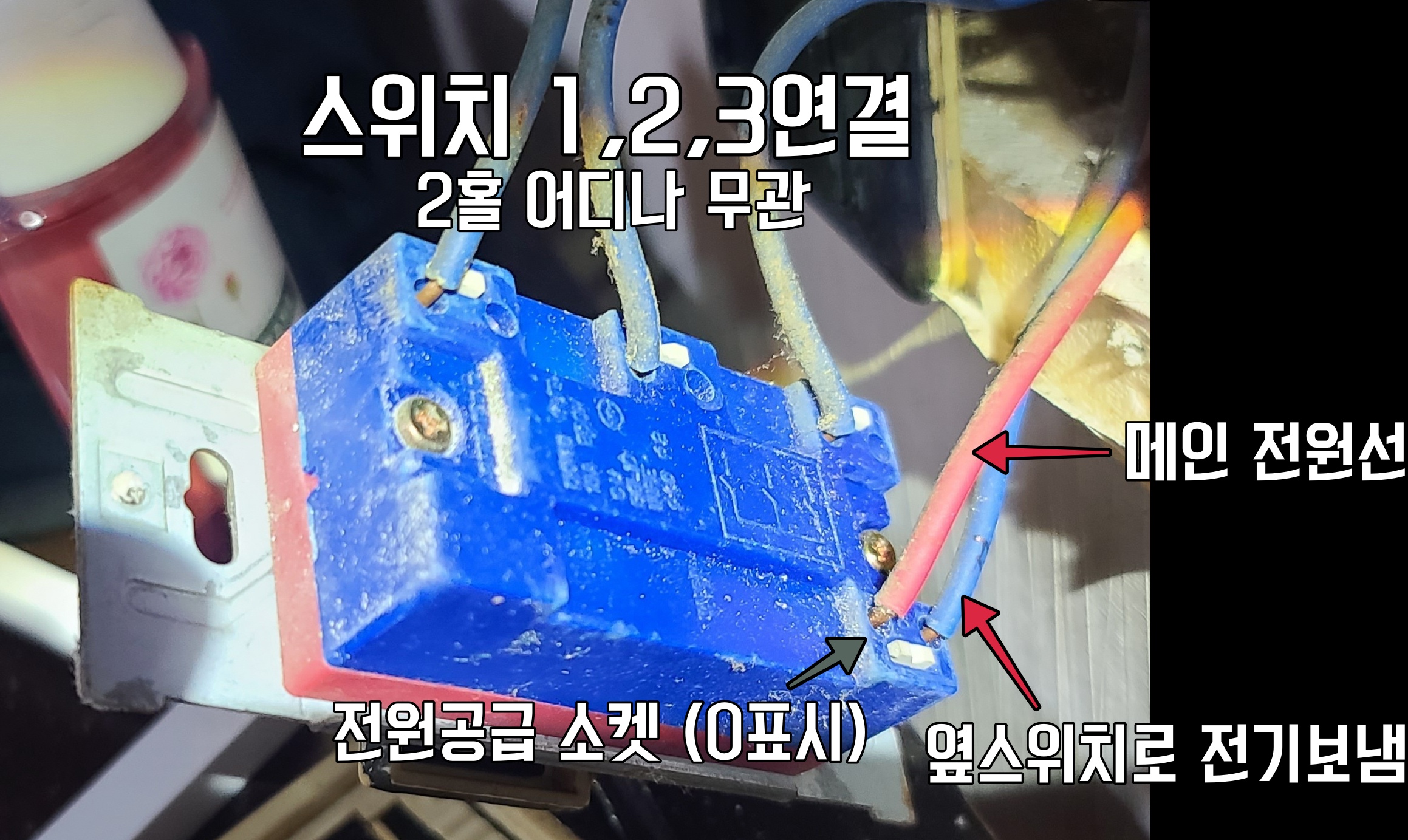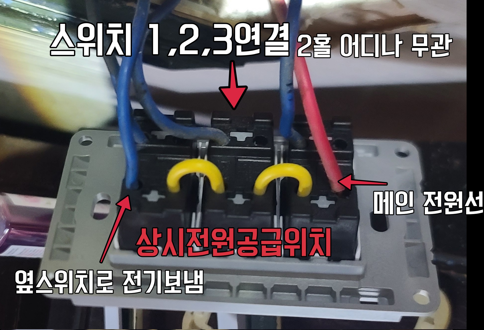 신형스위치는 이렇다. 위쪽은 동일, 아래는 상시전원공급부인데 노란전선은 스위치 구입 시 동봉되어 있었다. 아예 저렇게 연결시켜 나오는 제품도 있다고 한다. 적색선과 옆 스위치로 전원을 보내는 선이 연결되게 하면 됨.