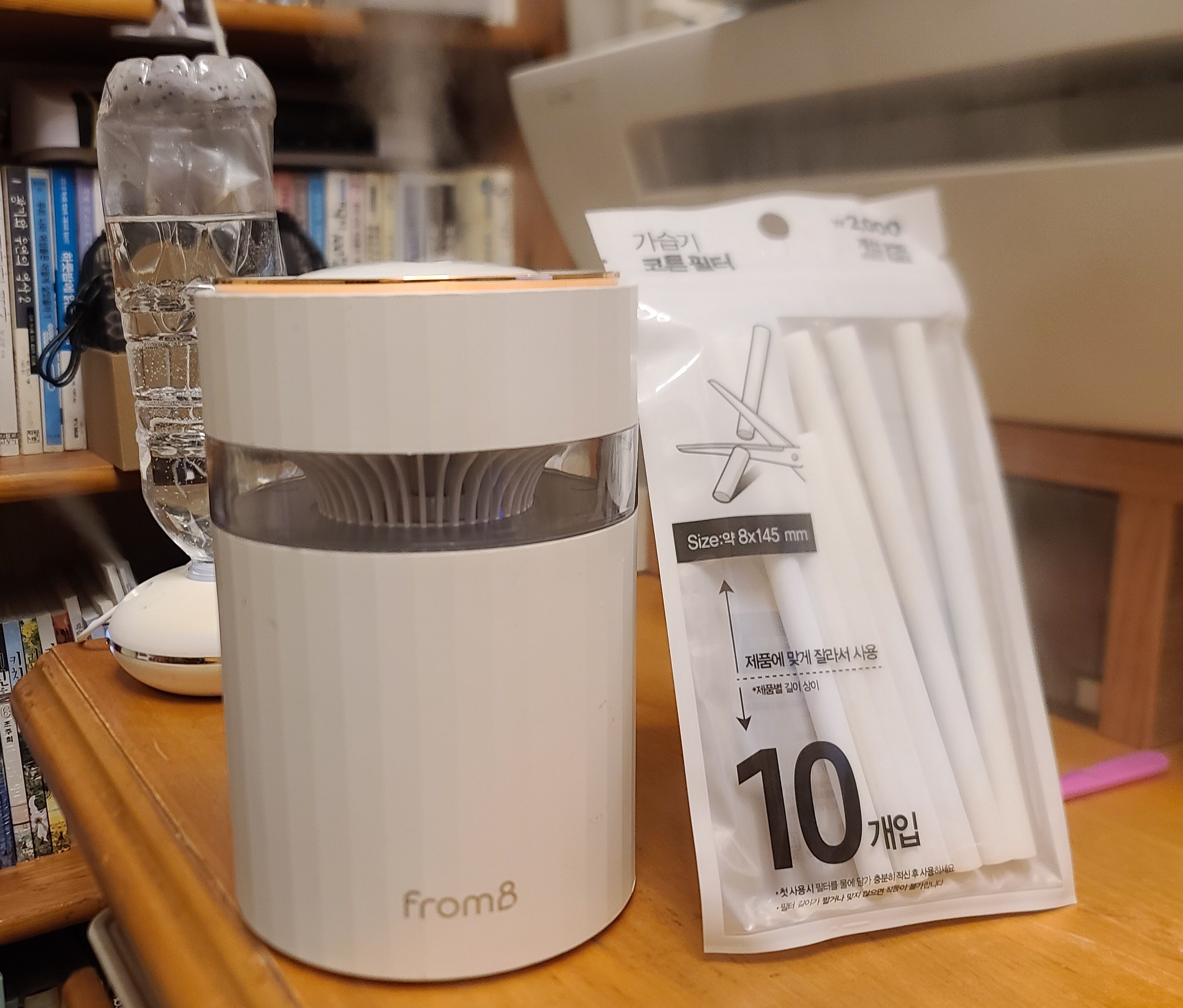 다이소에는 4개들이와 10개들이 필터가 있다. 4개들이는 직경7mm, 10개들이는 8mm*145mm다. 프롬비가습키 필터는 제법 굵었던 것 같은데, 일단 8mm직경 필터 구입해 끼웠다. 필터를 가습기 머리 부분의 구멍에 끼우고 필터케이스의 스프링 부위가 물에 잠기는 방향이다. 한참 두었는데 작동이 안된다. 분해하니 필터의 2/3정도까지 물이 적셔져 있다. 필터를 아래 위로 물에 담그고 약간 흔들어 물을 머금게 한 뒤 다시 설치하니 잘 된다. 145mm필터를 자르면 짧아져서 안됨.