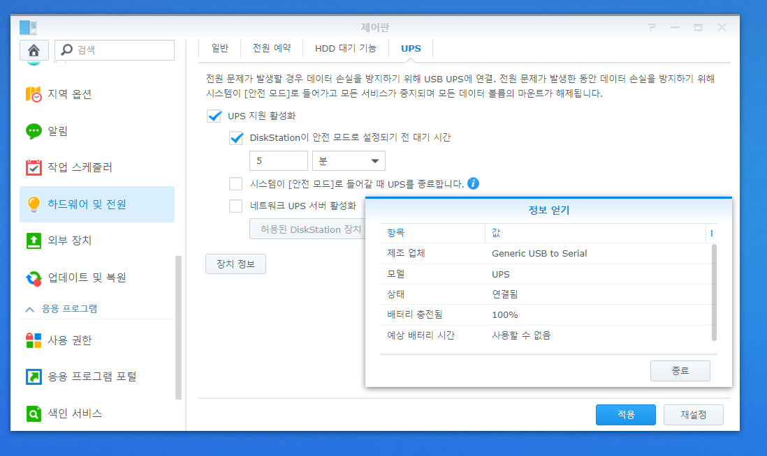 전기차 충전시 차단기가 자주 나가는 문제 때문, UPS는 delta VX600 제품으로 구입하여 설치함. 전원 - UPS - NAS로 연결함. UPS와 NAS를 동봉된 USB케이블로 연결하면 끝. 시놀로지 접속후 제어판-하드웨어 및 전원에서 UPS설정을 함. 일단 5분으로 대기시간을 잡아두었다. UPS용량이 360W이고 NAS가 60W이므로 배터리는 넉넉하겠네.