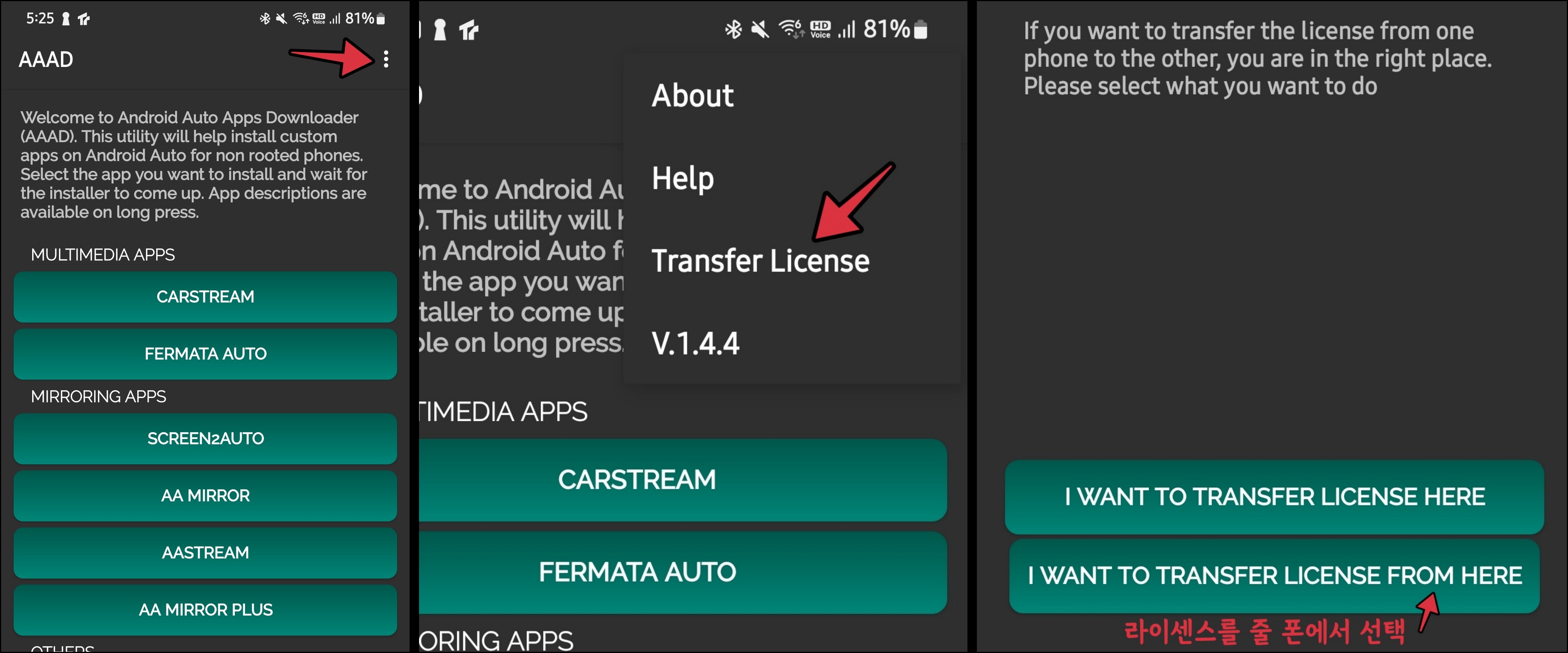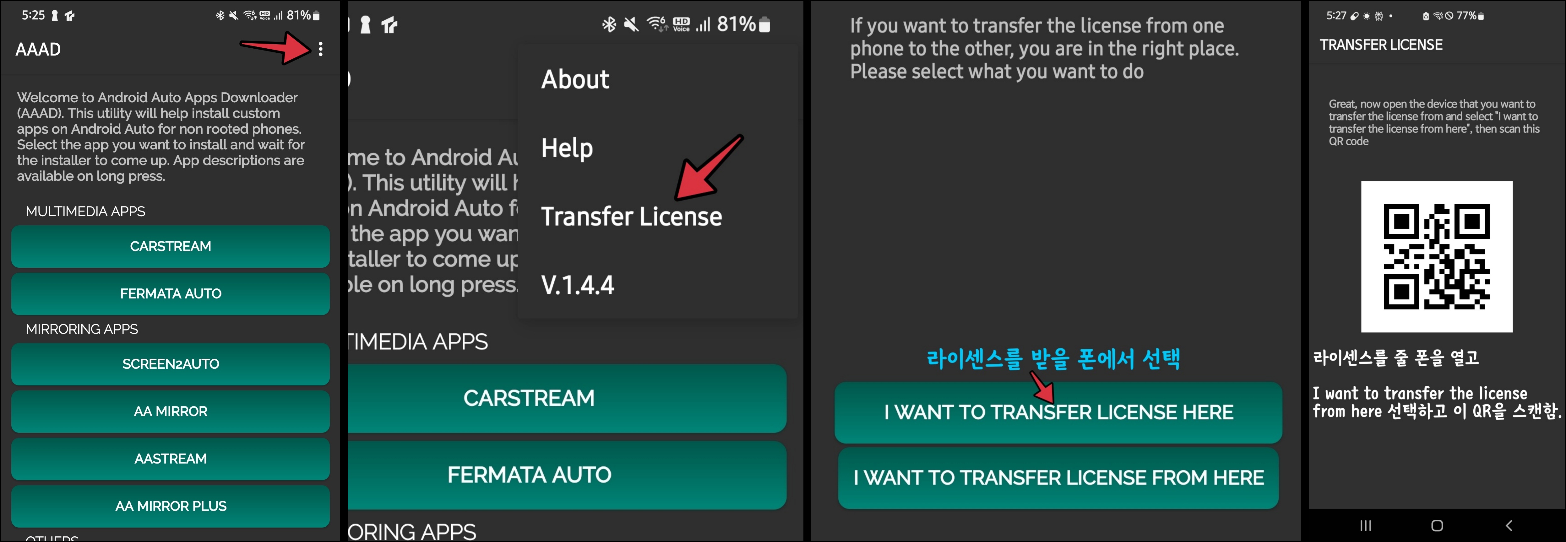 순서 (지난 글 참조) : AAAD앱 열고 AAAD안에서 Fermata Auto, AA Mirror Plus, Carstream 등등을 설치해야 한다. 이를 위해 구 폰에 깔린 AAAD앱에 라이센스가 있으니 새 폰으로 가져와야 한다.
