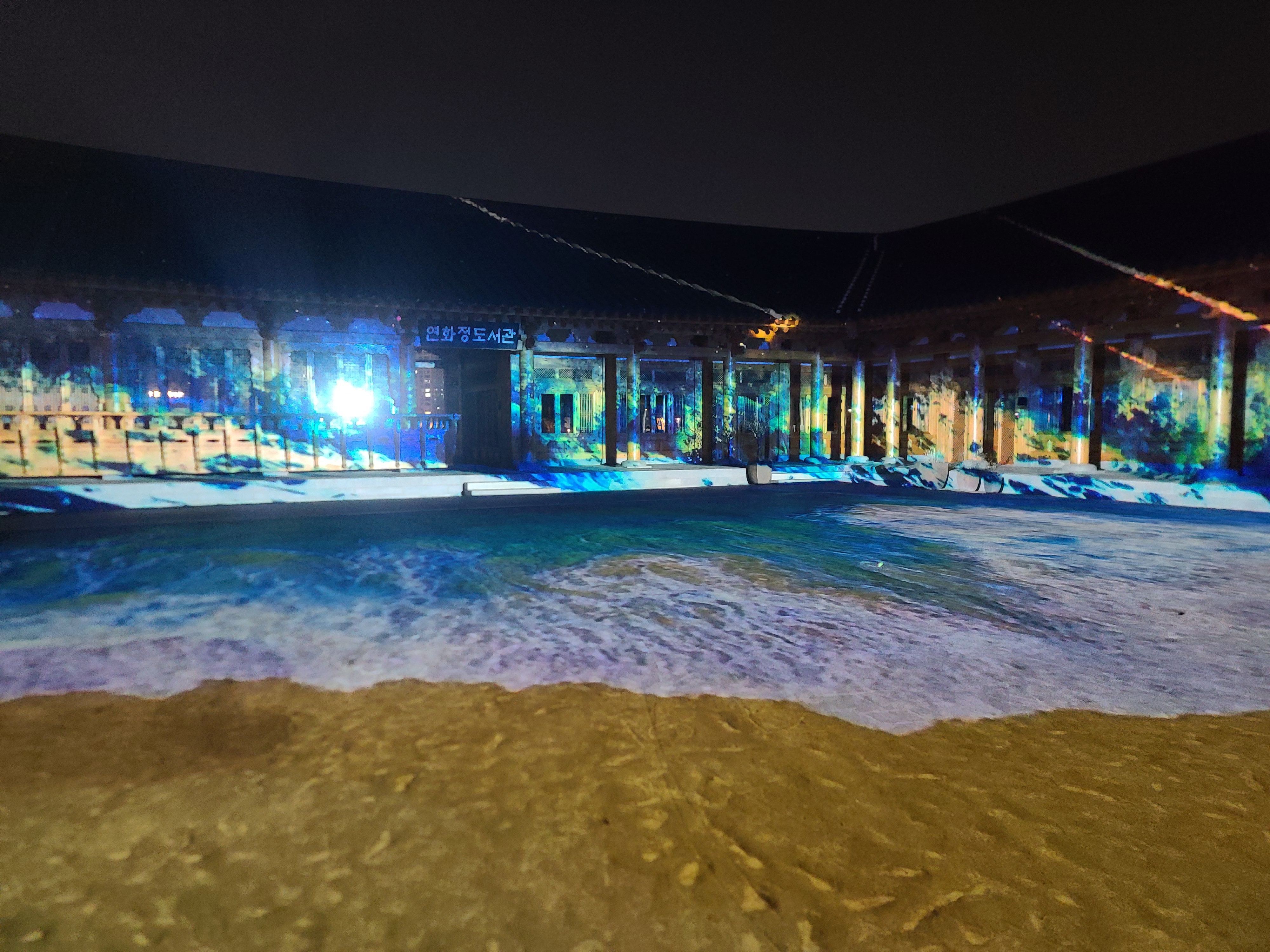 체크인하고 쉬다가 7시경 덕진공원에 갔다. 우연히 시간을 맞췄는데 7시부터 미디어 파사드 공연이 있다. 연화정 도서관 벽면과 마당면을 이용해서 꾸미는 25분에 걸친 공연. 특히 바닥에 밀려오는 파도를 표현하는 것은 동영상으로 찍으니 정말 실감났다.