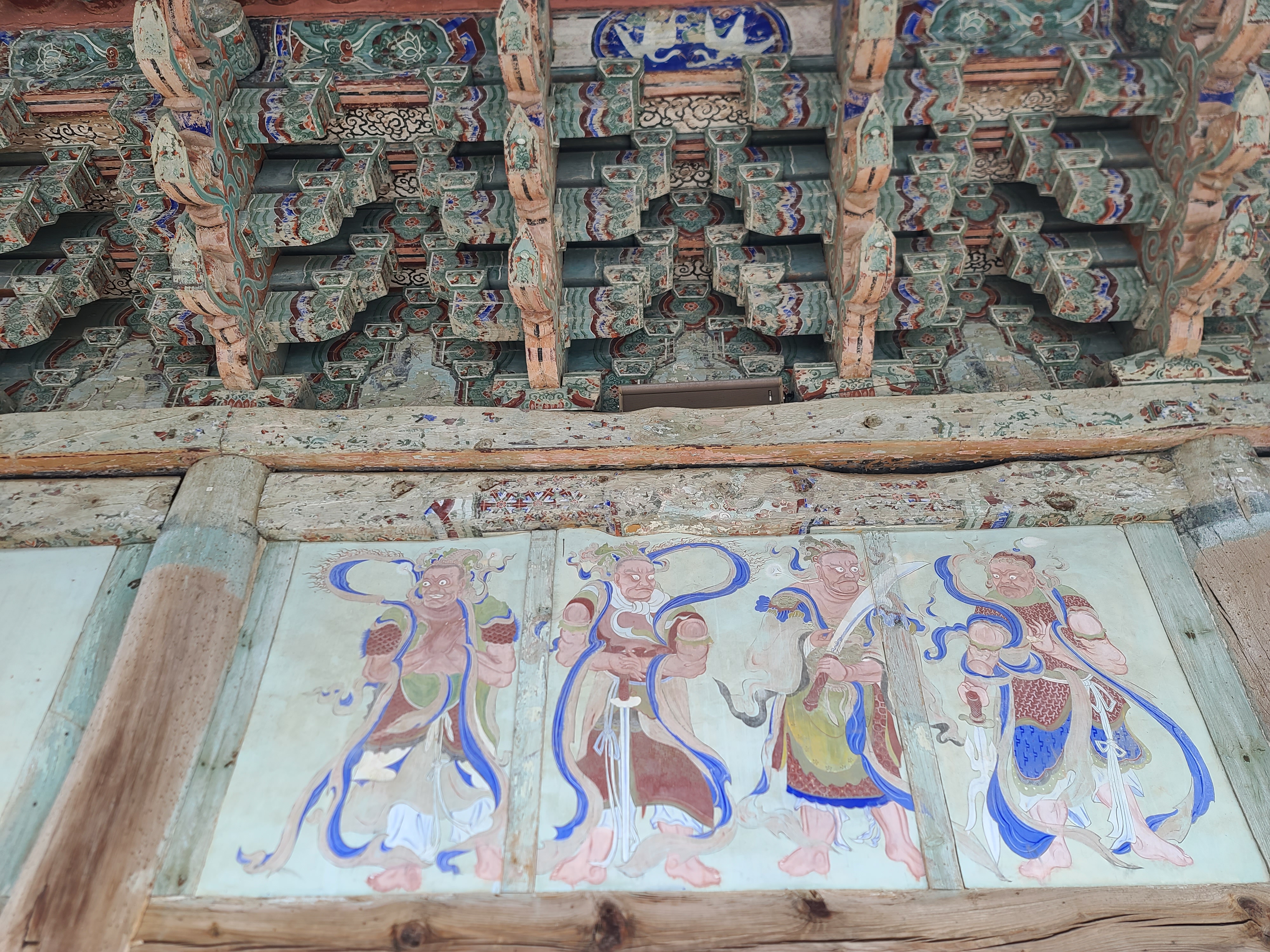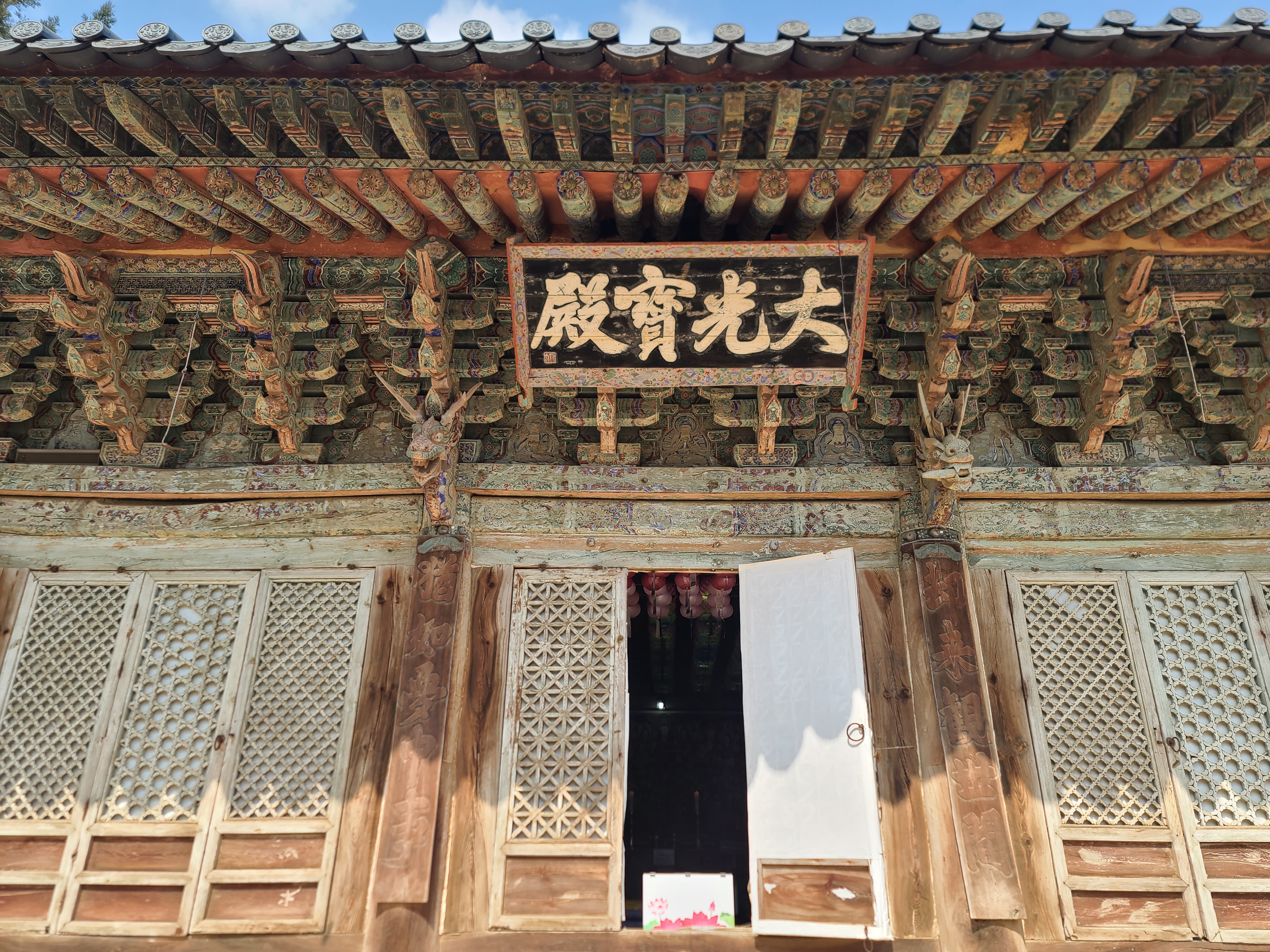 1층 대광보전은 건물 좌향은 남인데 불단은 동향이라 중문으로 들여다보면 왼쪽 벽면에 부처가 있는 신기한 구조다. 동편을 면하고 있는데 대광보전은 오래된 나무기둥과 바랜 단청을 그대로 유지하고 있어서 더 웅장해 보인다. 기둥은 자연목을 그대로 살렸고 외부처리가 안되어 있어서 나무질감을 그대로 느낄 수 있었다. 삭고 있는 곳도 그대로다. 나무를 다듬지 않는 방식은 조선 후기의 건축기법이라고 한다.