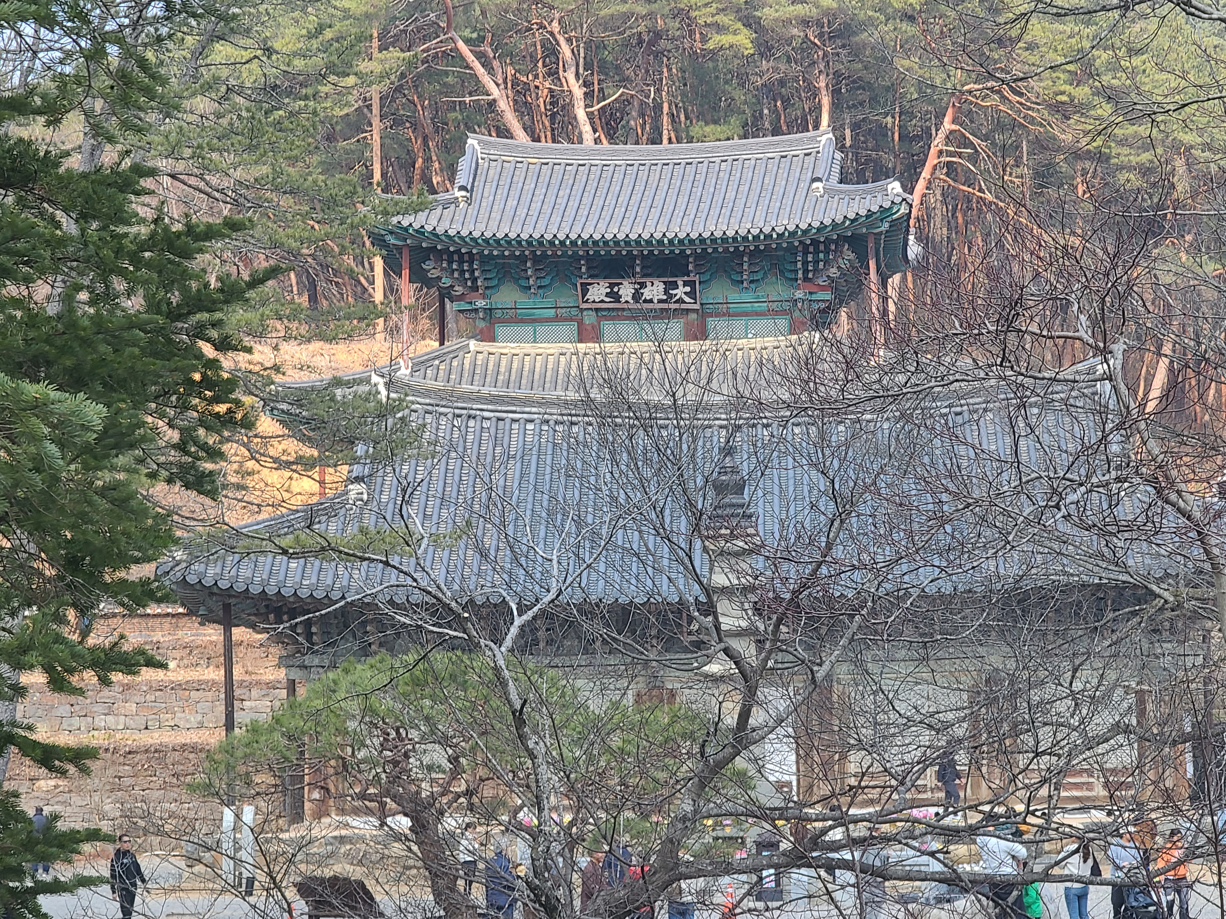 마곡사 앞 주차장은 비싸서인지 만차는 아니다. 주차장에서 보니 아랫단 단층건물 대광보전과 윗단 2층건물 대웅보전이 마치 3층의 한 건물인 것처럼 보이다가 조금 가까이 가니 대웅보전이 2층이 아니라 따로 떨어진 두 전각처럼보였다가 다시 조금 가까이 가니 원래의 단층과 2층건물로 보이는 신기한 경험을 했다.