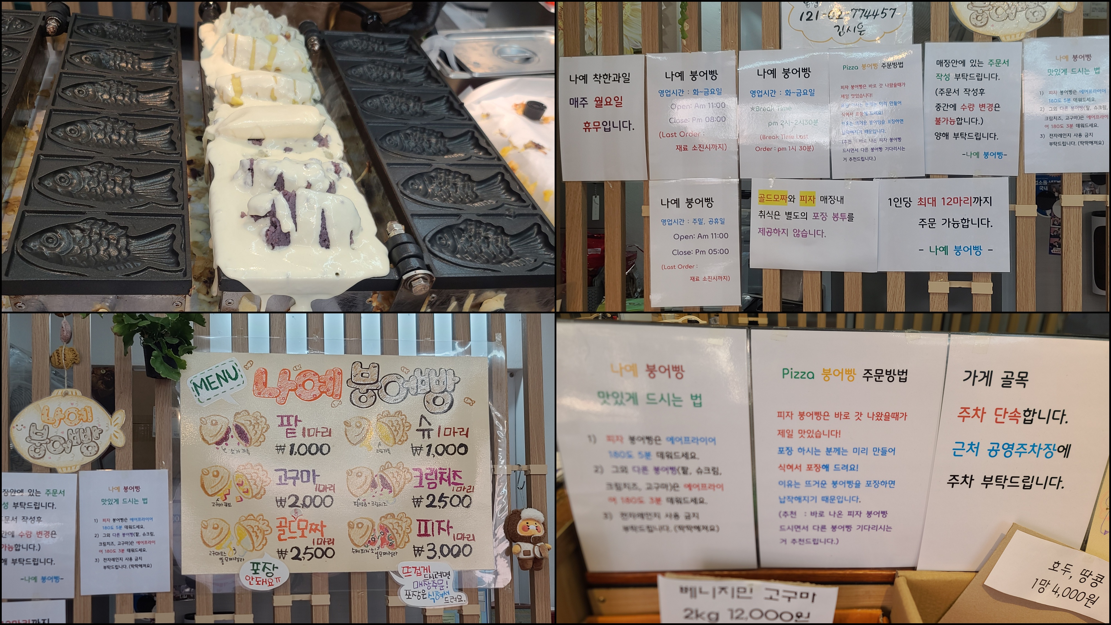 국도로 평택의 유명한 나예착한과일에 갔다. 테두리붕어빵의 원조. 슈붕 팥붕 두 개 씩, 피자와 치즈 구입. 치즈는 무척 고급을 쓰신다. 팥소는 아주 달지 않은 순순한 맛, 우리 입맛엔 슈붕보다 팥붕이다.