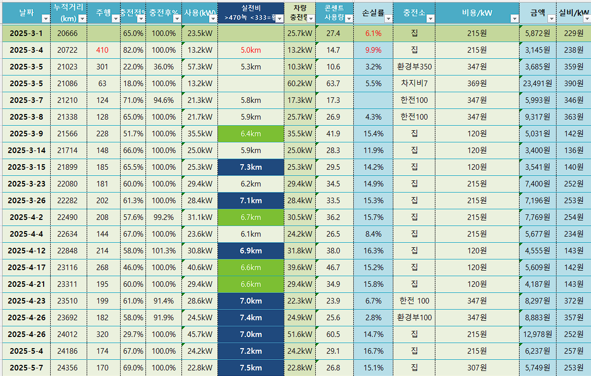최고 기록은 5/7일 170km주행에 22.8kW 사용 (전비 7.5km) 최악 기록은 1/10일 238km에 56.6kW사용 (전비 4.2km)였습니다.