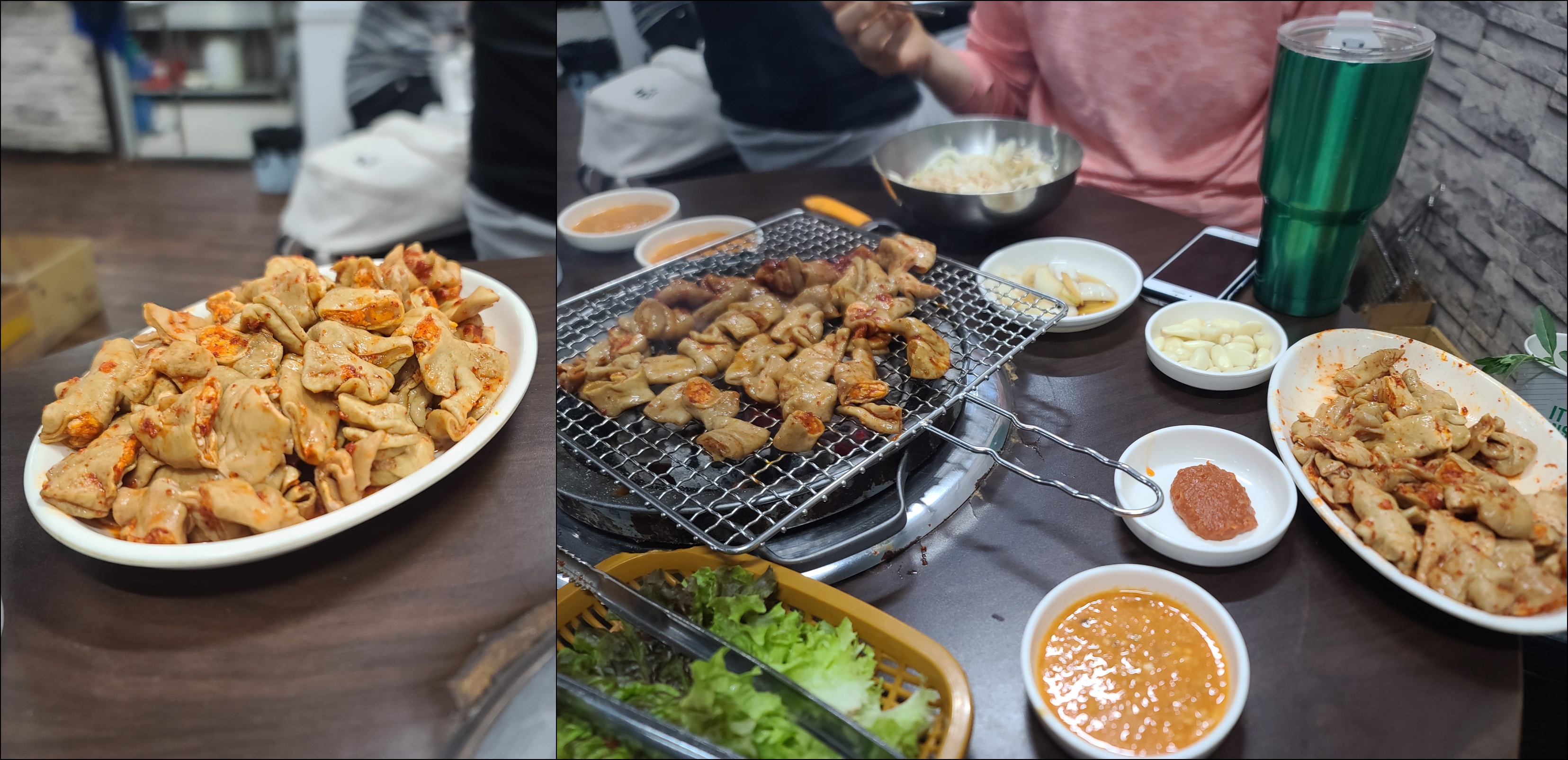 휴게소 하나만 들르고 3시 10분경 도착. 도마동 3공영주차장 충전기에 물리고 식당에 갔다. 주차비는 최초 1시간 무료 이후 10분에 200원이다. 충전기는 휴맥스였는데 일렉 페이는 안 되고 ev페이로 가능했다. 양념갈비,생목살,고추장갈비,닭갈비 중 최고는 양념갈비 최저는 생목살이다. 좀 퍽퍽했다 닭갈비도 좋았지만 3순위. 처음에 가져온 한 판만 먹고 충분히 배불렀다. 주차권은 공영 주차장 1시간권을 주셨다. 1시간 10분 주차비 200원이 나왔는데 30분 주차권 하나로 해결.