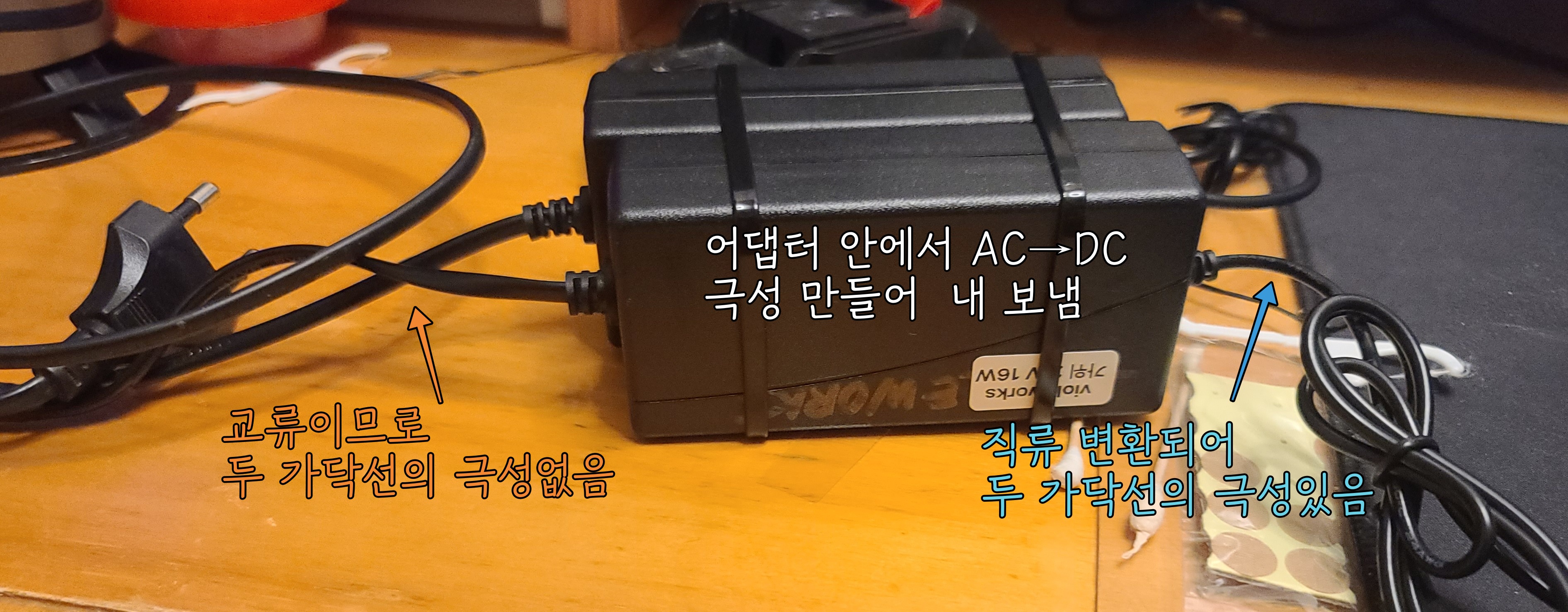 - 단선된 어댑터의 AC(교류) 입력선은 대부분 극성(Hot/Neutral)에 관계없이 연결해도 어댑터 작동 자체에는 문제가 없습니다. 한국에서 사용하는 일반 220V 교류 전원은 플러그를 콘센트에 꽂는 방향을 바꿀 수 있게 되어 있어, 기기 내부에서 극성을 고려하도록 설계되기 때문입니다. 어댑터는 교류를 직류로 변환하는 장치이므로, 입력되는 AC 전원선의 두 가닥 순서가 바뀌어도 출력되는 **DC 전원의 극성(+/-)**에는 영향을 주지 않습니다.