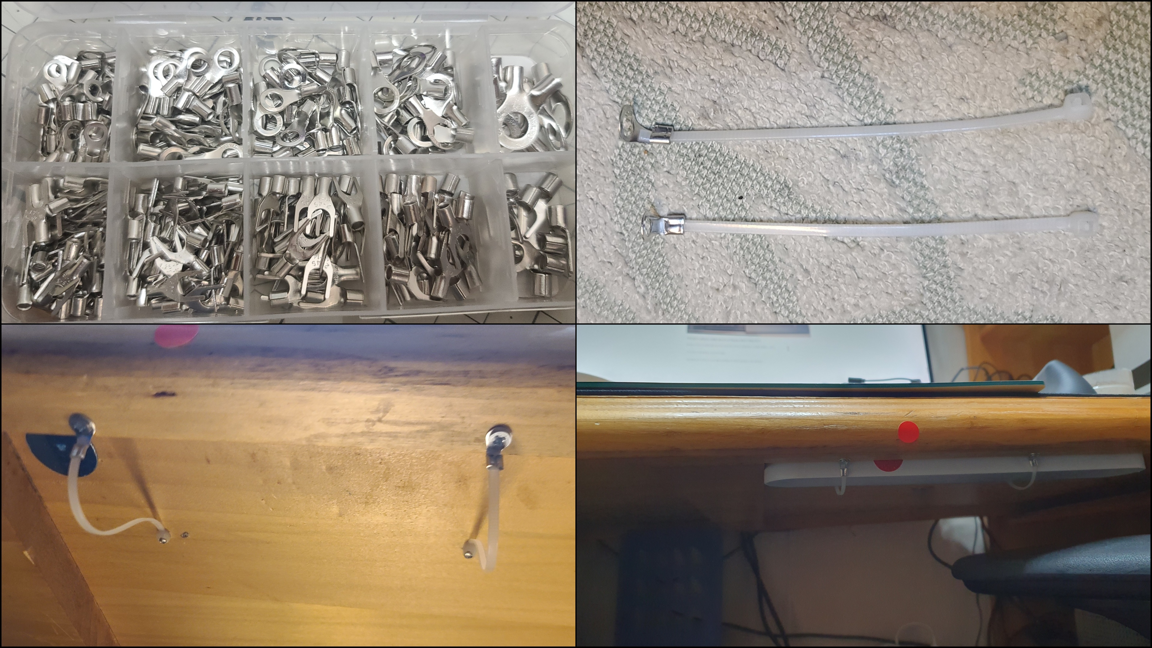 충전등을 책상 아래 자석으로 붙여 설치했는데 약간의 충격에도 계속 떨어진다. 체인 같은 것으로 고리를 만들어 고정하면 좋겠는데... 하다가 오늘 개발. 자석의 부착력을 보조해주는 데는 충분.