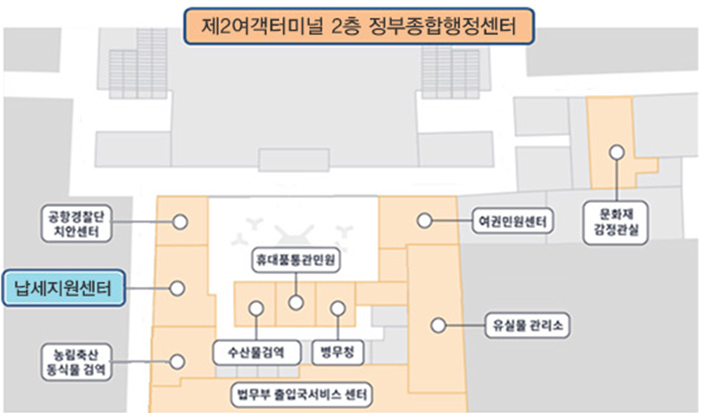 ○인천공항 제2여객터미널 2층 중앙부에 있는 「정부종합행정센터」 내 납세지원센터에 위치