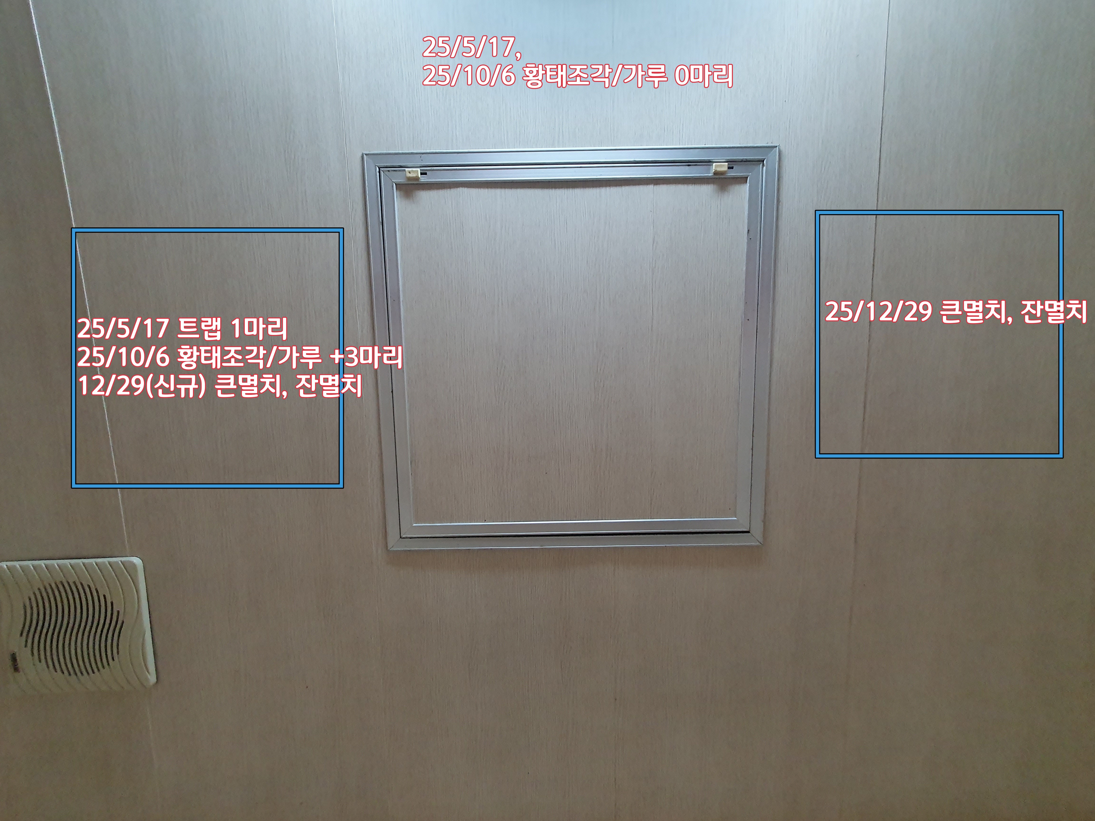 23/10월 3방향으로 설치한 트랩(멸치와 꾸이포) 붙였는데 24/03월 10마리 잡혔다.