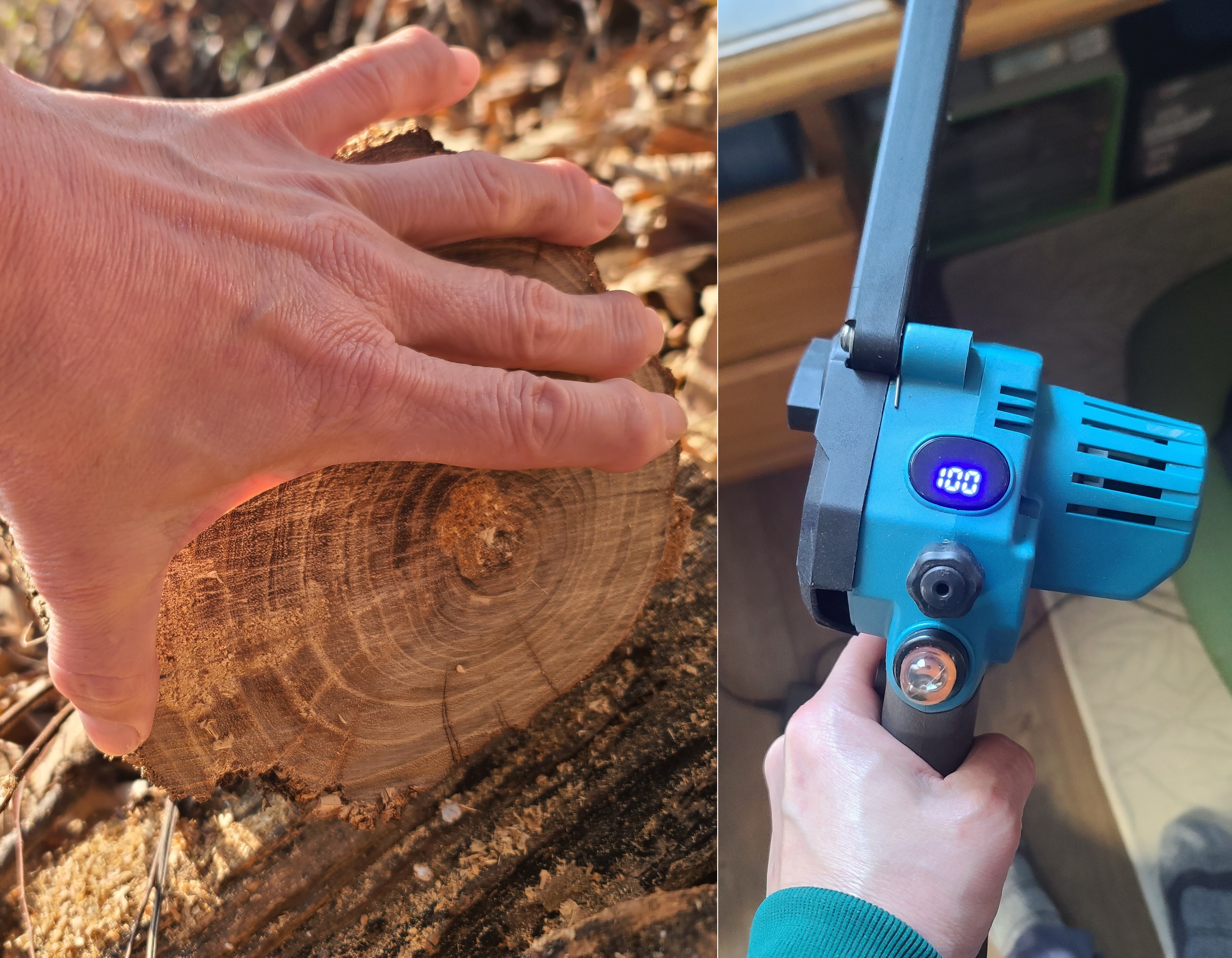 앞산에 베어 놓고 방치한 나무가 있어서 체인톱으로 잘라왔다. 25/11/22 구입했던 8인치 Gisam체인톱 성능 측정도 할 겸 하여. 바짝 마른 16cm직경의 아까시나무를 두어 번 정지하면서도 제대로 잘라낸다. 번들배터리는 1.5A의 적은 용량인데 4번 정도 컷팅 후에 80% 남음. 뭐, 이정도도 괜찮다. 마끼다 호환배터리로 교체했더니 조금 힘이 더 생긴 듯 하지만 번들배터리에 비해 배터리 용량 변화가 들쭉 날쭉 불안정하군.