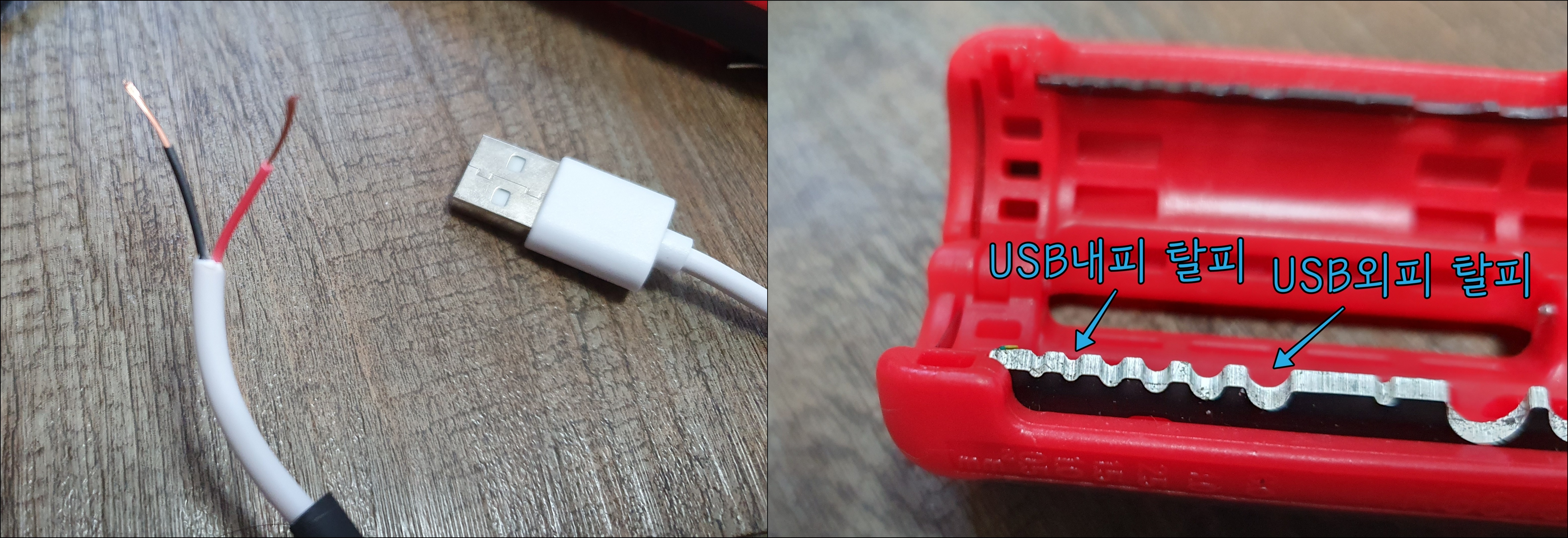 1. 외피를 2cm 가량 벗기고 속선은 1cm가량 벗기고 미리 수축튜브를 넣어두었다. 내피와 외피 탈피게이지는 사진과 같다.