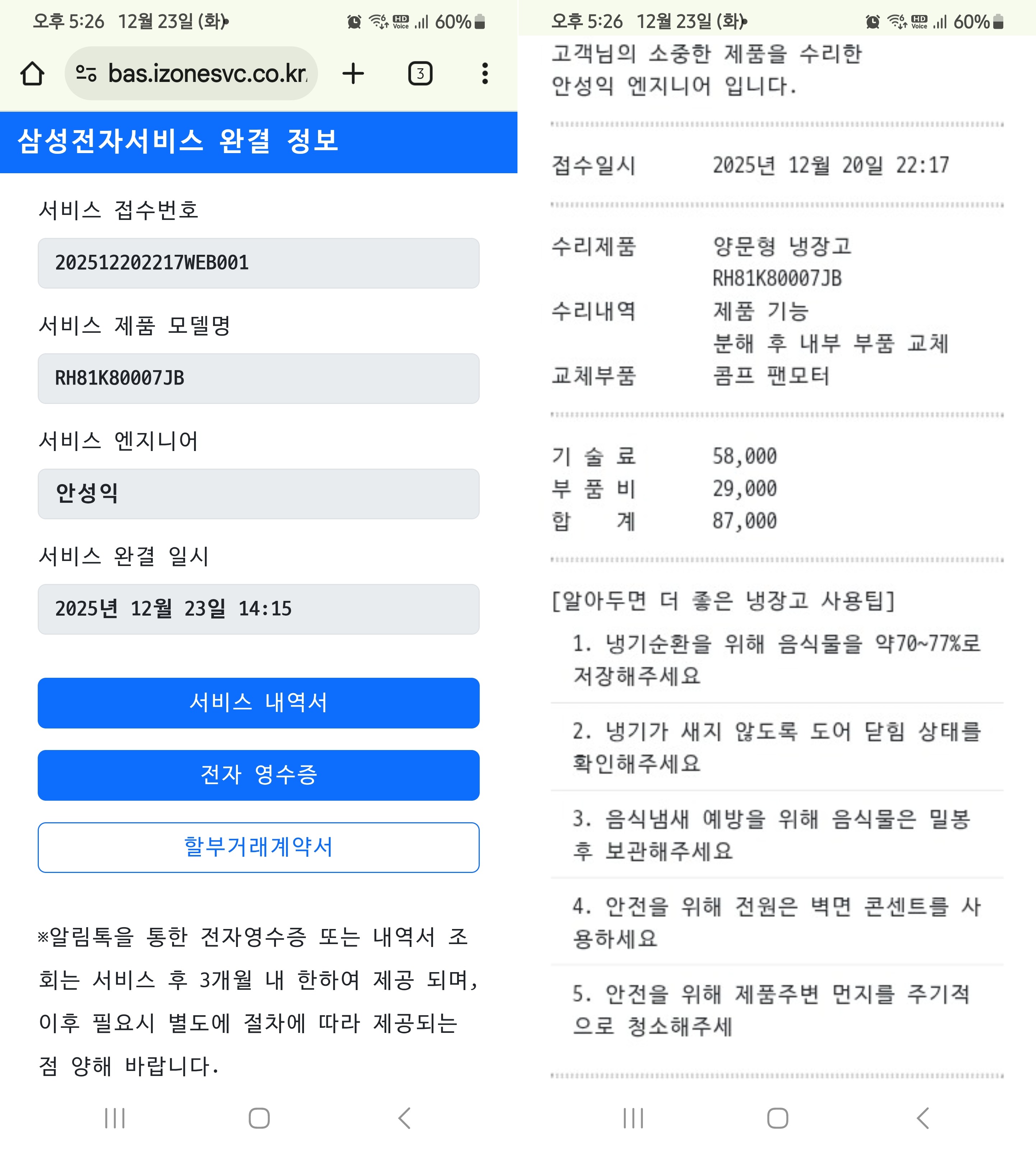12/23(화) 삼성 양문형 냉장고 수리 기록