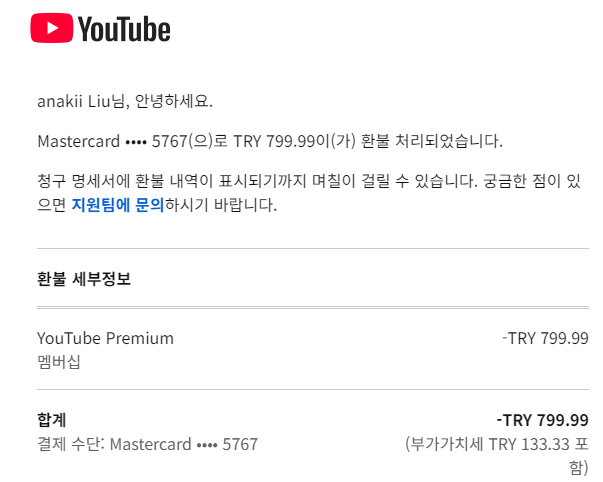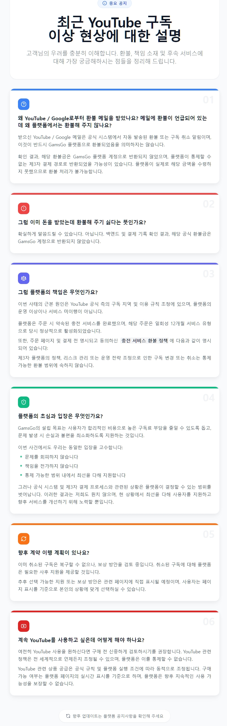Gamsgo 사이트에서 이용하던 유튜브 프리미엄 계정이 막혔다. 6개월 남았는데도 Gamsgo에서는 유튜브 정책에 따른 것이므로 환불 안된다고 발뺌한다. 지메일에 들어가 보니 유튜브에서 내 계정에 대해 환불처리되었다고 한다.