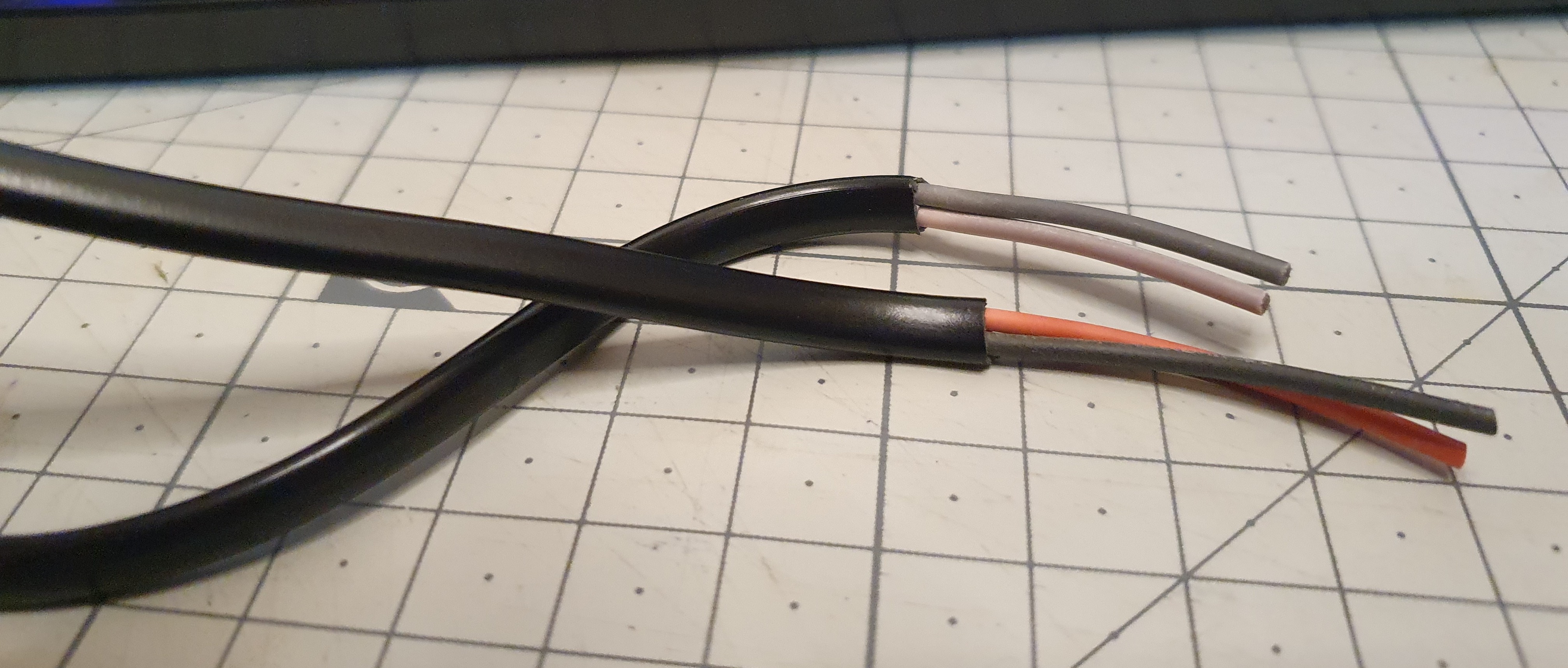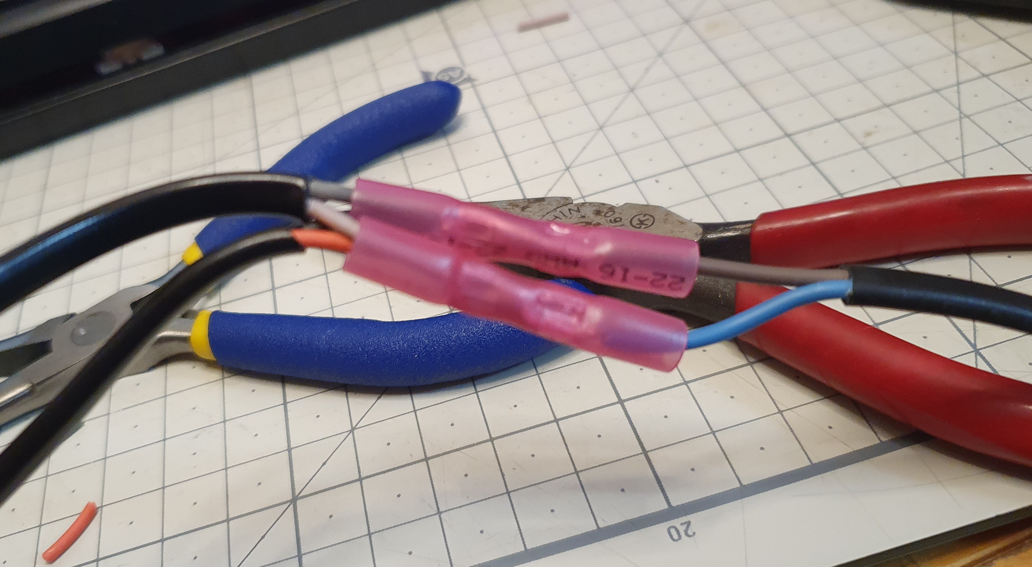 일단 회색끼리 연결, 흰색과 적색선을 연결했다. 선이 가늘어 겨우 연결하고 반으로 접어 비절연 압착 단자 1mm에 넣어 압착기로 꽉 물어서 단단하게 만들고 나서 열 수축 와이어 키트 (22-16AWG) 에 넣고 꽉 물었다. 맨처음 외부 피복을 까는 게 힘들다. 약간만 힘을 주면 내부피복이 잘린다.