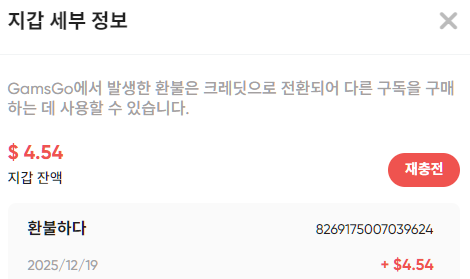 그런데 저 카드는 물론 내 카드가 아니라 감스고에서 설정한 카드이며 감스고에서는 환불 정보가 없다고 하면서 크레딧으로 보상해 준다고 한다. 보상 금액은 4.54달러. 이마저도 감스고 구독 제품을 구입할 때 쓸 수 있는 거라 별무쓸모.