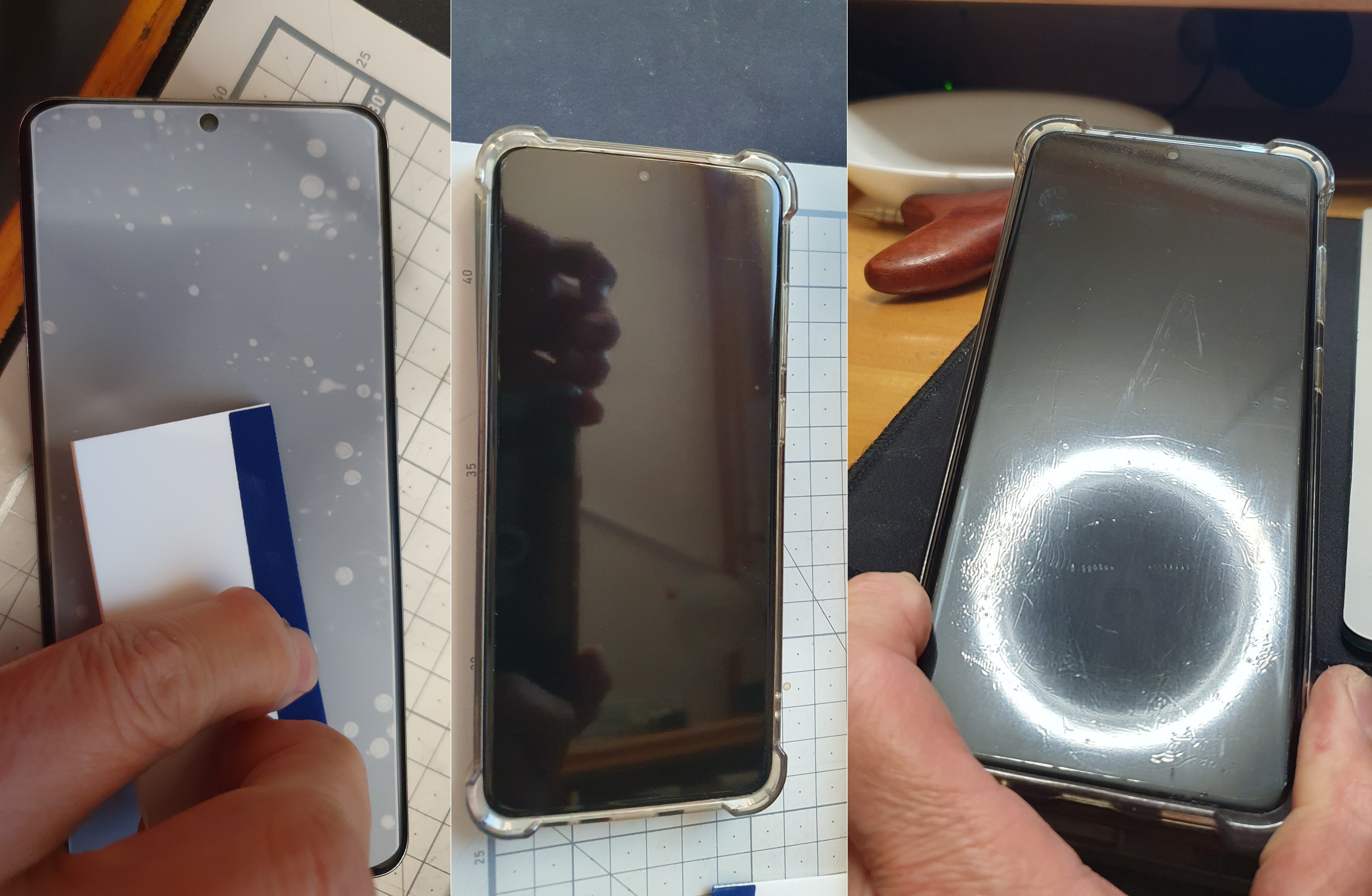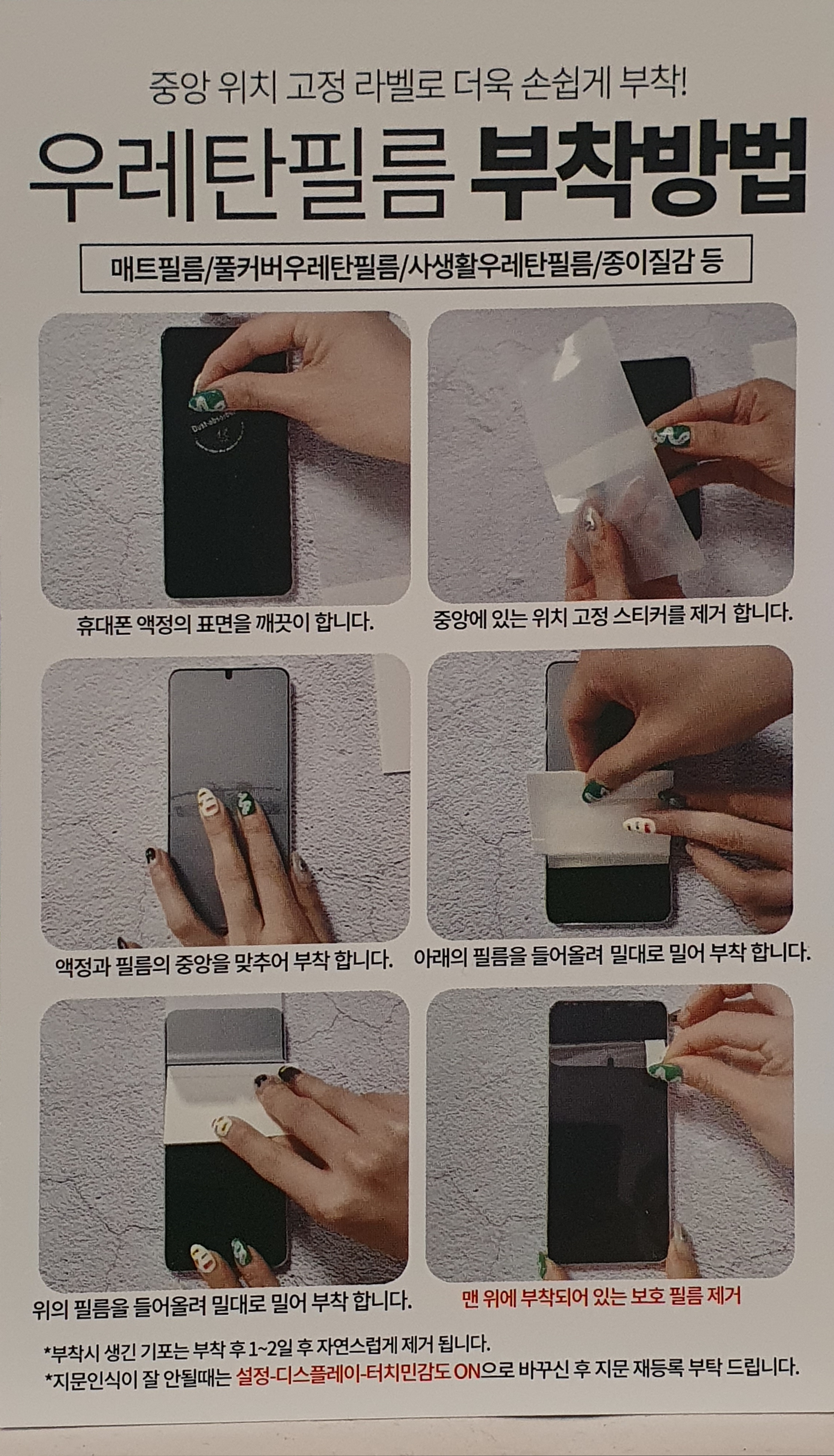 12/24/2603 ICON제품은 붙이기 어렵고 내구성이 약하다. 불투명 면이 먼저 위로, 상단 보호지 아래에서부터 벗겨 내는 것이 어렵고, 상단 붙인 후 하단 보호지를 떼 내는 건 더 어렵다. 보호지가 너무 강하게 접착되어 있다. 전면보호지를 붙인 채로 기포 제거 10여분. 완벽하게 안되었는데 하루 지나니 꽤 깨끗해졌다. 아이콘 제품은 빛에 비추어 보면 주름 현상이 심해 보인다. (좌 12/25 - 우 12/31)