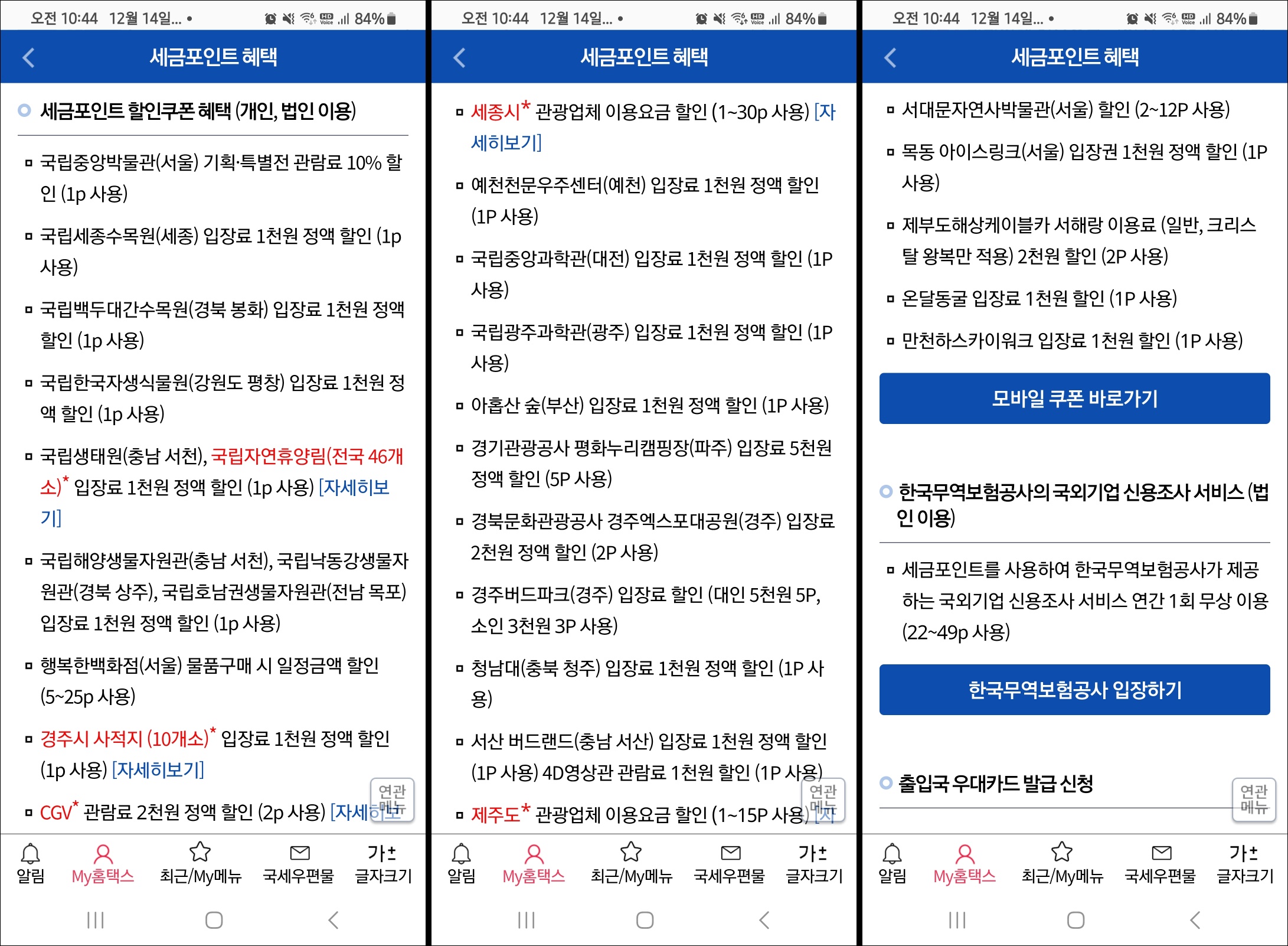2) 손택스 앱 > My홈택스 > 세금포인트 > 세금포인트 혜택 > 모바일쿠폰 > 할인쿠폰 발행에서 원하는 매수를 발행해 입장시 매표소에서 보여 주면 됨.