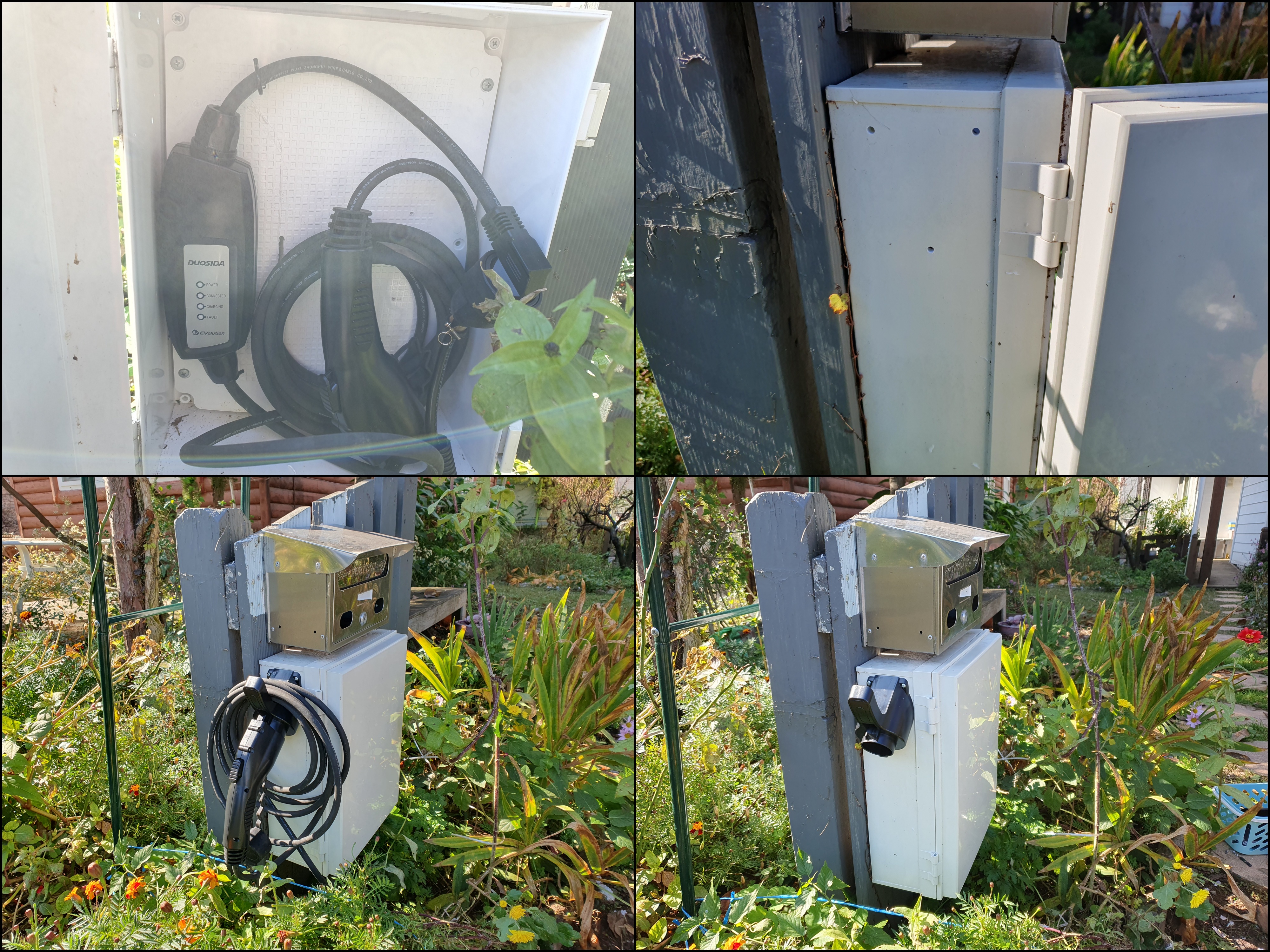 케이블 홀더는 충전 박스 옆에 5mm 구멍을 뚫은 뒤 볼트와 너트로 고정했다. 케이블 감아 보니 과연 고정이 잘 되긴 하는데 궂이 눈비 맞혀 가며 케이블을 외부에 둘 필요가 있을까. 처마가 있다면 모를까. 일단 설치만 해 둔다.