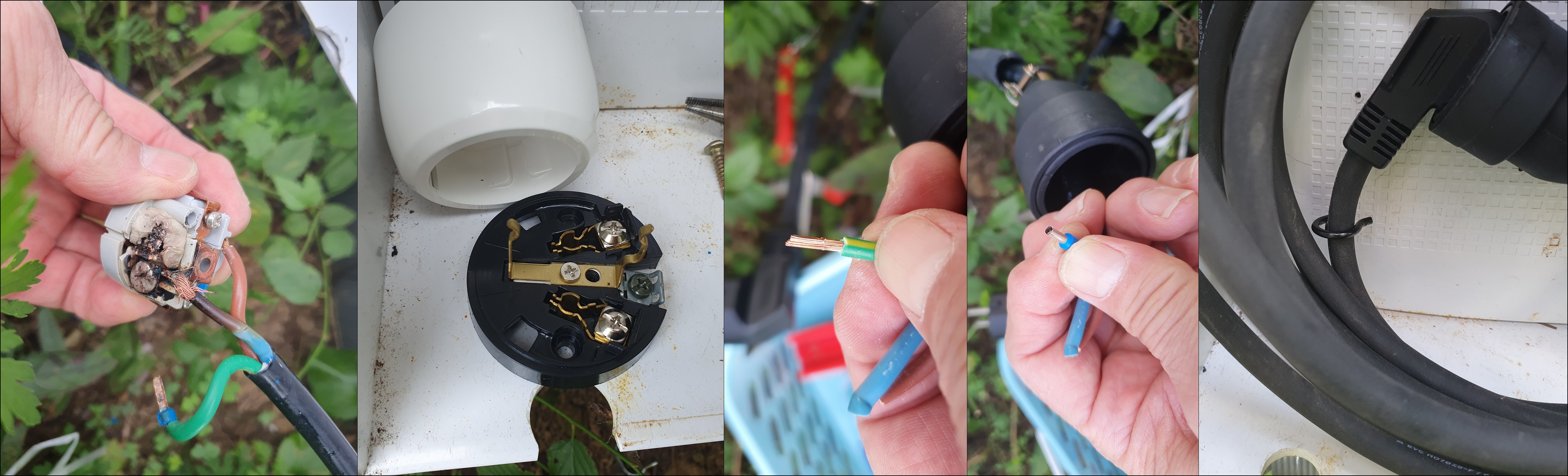 눌어 붙은 콘센트는 분리도 안된다. 고무를 잘라 완전히 분리해 해체함. 전선 연결부도 눌어 붙었다. 전선을 자르고 새로 피복을 벗겨 전선을 만든다. 두 개 중 부착형 콘센트는 선 연결부가 너무 짧아 포기하고 고무콘센트에 연결했다. 2.5sq선 피복은 1cm정도 벗기니 파란 색 페룰에 적당히 들어간다.