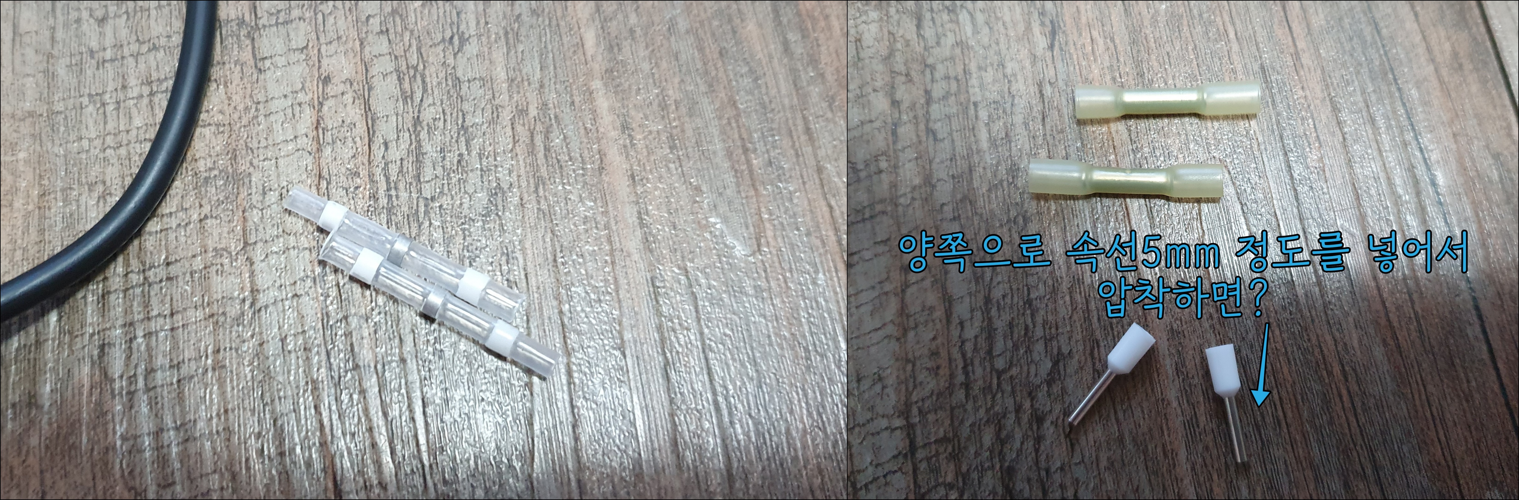전원 공급부의 선은 파란색이 실선, 흰선이 중성선이었다. 두 선을 5mm정도 까서 비절연 압착 단자 1mm에 넣어 압착기로 꽉 물어서 단단하게 만들고 나서 열 수축 와이어 키트 (22-16AWG) 에 넣고 꽉 물었다.