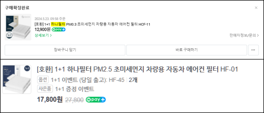 하나필터 고급 HCF-45가 24년에는 개당 6500원. 25년에는 8800원. 헉. 결국 1등급 낮은 HF-45 (개당 4500원) 구입.