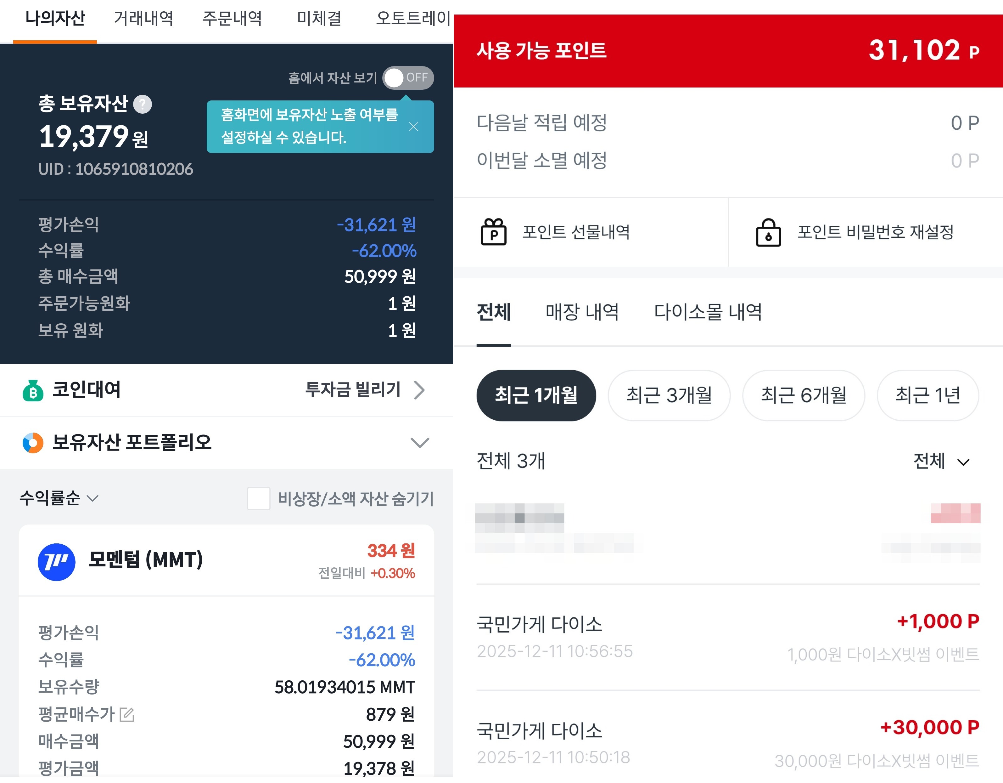 가상자산이라는게 대동강 물 팔아먹었다던 봉이김선달과 정확히 같은 논리라서 무조건 멀리했는데 8만원 준다는 말에 일단 구경만 할까 했지. 12월에 준다는 다이소 포인트는 잊어버리고 있다 오늘 다이소몰 앱 들어가서 확인하니 31000포인트가 들어와 있네. 캬...
