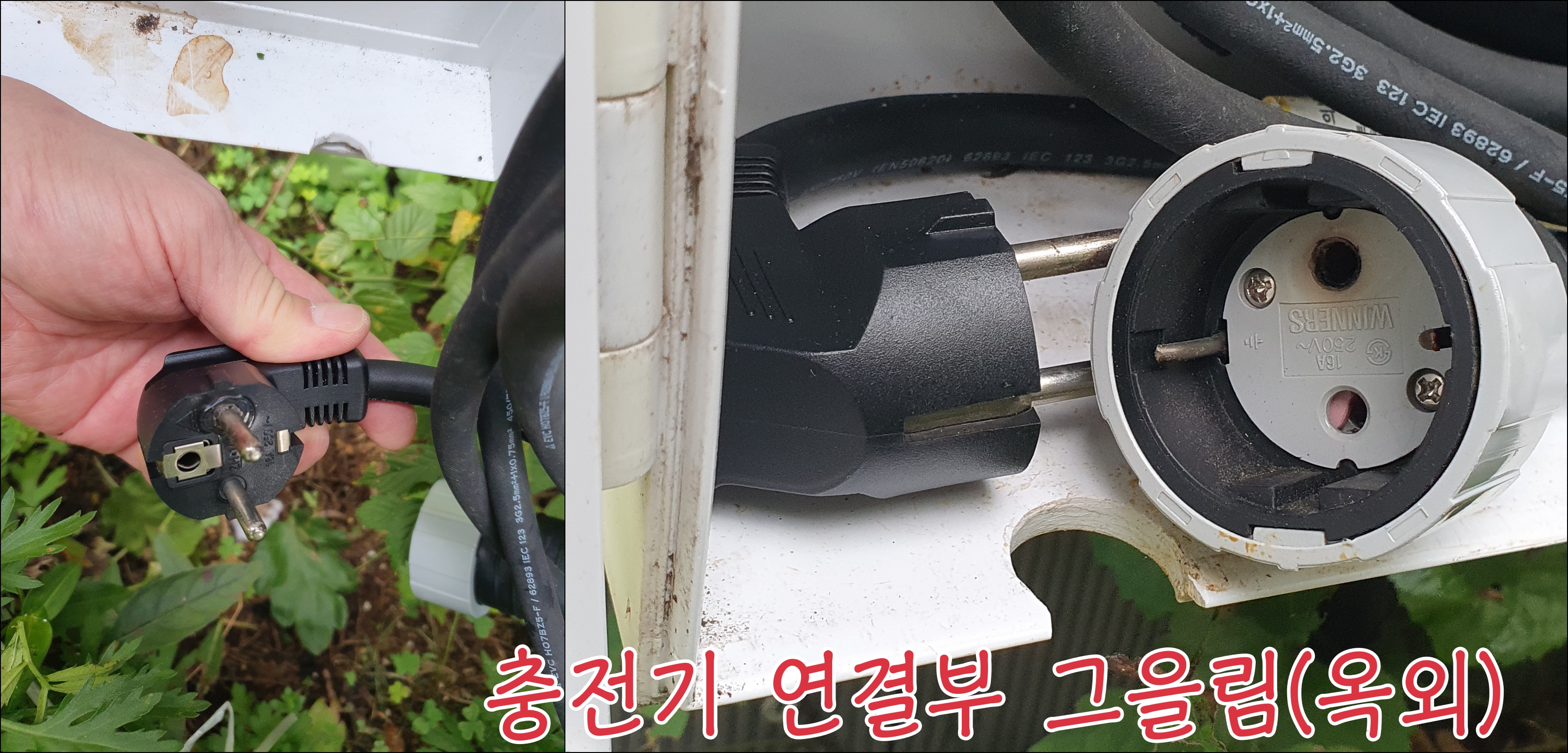 콘센트와 연장선 모두 새로 설치한 거라서 설마하고 뽑아 볼 생각을 안했었는데. 옥외 전기박스에 넣었던 충전기를 확인해보니 충전기 플러그와 연장선 콘센트가 그을려 있었다. 작년3월 전기레인지 연결콘센트와 비슷한 증상이네. 원인을 찾아서 다행이다.