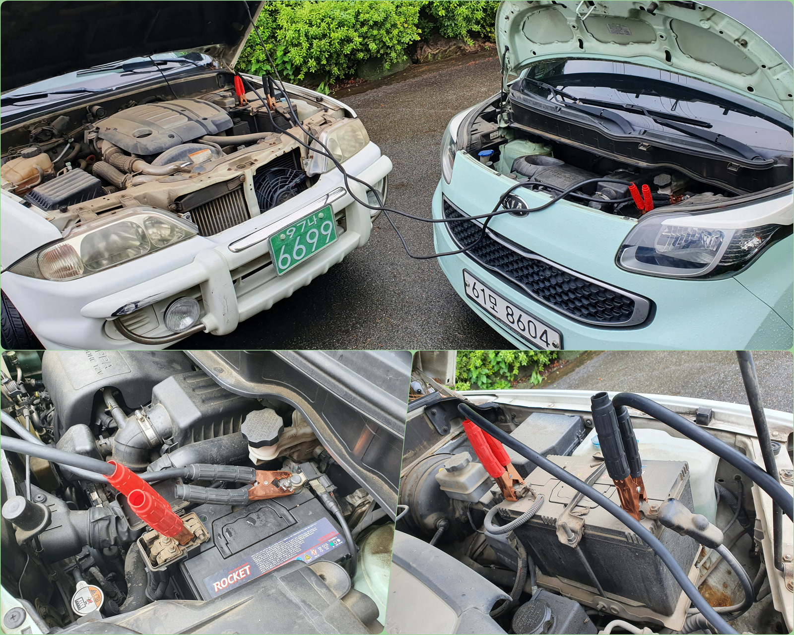 1) 선 연결할 때는 두 차 모두 차 키를 빼고 하자. 자칫 ON상태에서 연결하다 스파크가 나면 고압 서지 전류가 흘러 차량 컴퓨터를 망가뜨릴 수 있음.