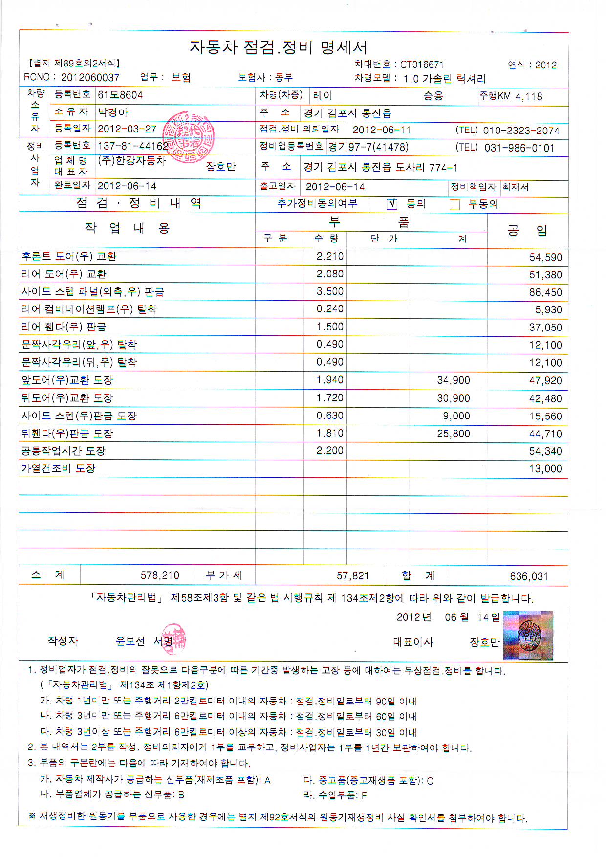 수리 내역 : 엔진오일 60, 인테이크 호스 교환 16 점화플러그/코일 교환 136, 밋션오일 130, 연소실 카본제거 및 인젝터크리닝 285, 브레이크오일 98, 뒷 라이닝 교환 85, 로커암 가스켓 및 프론트케이스 씰링 350, 크랭크오일씰 25, A/C필터교환 35, 워터펌프교환 150,. 크랭크각센서와 타이밍체인가이드 교환은 서비스란다.