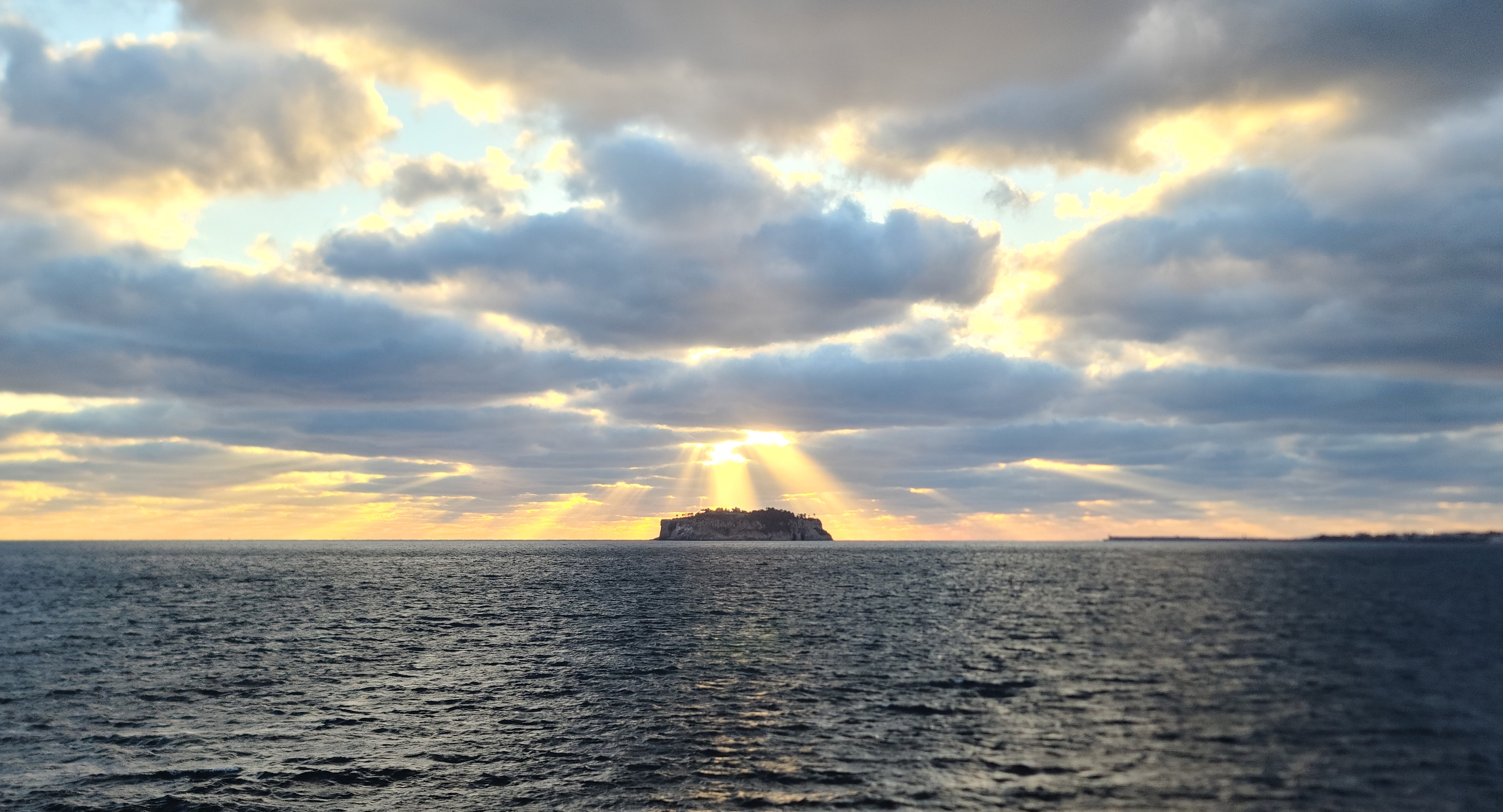세연교 위에서 범섬을 바라봤더니 범섬 위로 구름에 빛이 비치는 모습이 장관이다 세연교 위를 지나가는 바람 소리가 무시무시하다. 새삼 한바퀴 돌아 나오니 범섬 옆으로 해가 진다.