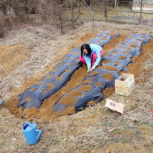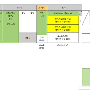 파종4 고구마 파종, 관리일지 (5/9~) 고구마 두 단 14000원 (농협 영농자재 백화점) / 호박 3개 1000원 (김포장) 5/9 (토) 파종 아침 7:00에 작업 시작, 8시 반에 작업 끝. 세 두둑 밭, 두 줄씩 심어 두 단이 꼭 맞게 들어간다. 간격 25cm. 잎 3~4개만 남기고 나머지는 정리해서 긴 작대기 모양으로 만들어 심음. [고구마 도구는 위에서 누르는 것(X) 아래서 받쳐 데리고 내려가는 방향(O)] 5/17~20 활착 중심고 뜨거운 볕이 강해 비닐에 닿았던 줄기는 모조리 시들었지만 그래도 활착 중이다. 튼튼한 편으로 자란다.모종 자체가 짧고 굵었던 것들이 훨씬 낫다. 물을 꾸준히 주고 있다. 거의 이틀에 한 번 꼴. [5/17 활착 중] [5/20 활착 중] LOG/영농일기 2015. 5. 20. 4/21~29 땅콩/옥수수 발아, 파종,싹 4/21(화) 땅콩, 옥수수 휴지발아 휴지에 물 듬뿍 묻혀, 땅콩 30립, 옥수수 80립 발아 시도. 4/23(목) 발아 중 2/3 정도 발아 중. 땅콩은 싹만 살짝 나온 상태, 옥수수 역시 뿌리만 살짝 나온 상태. 생각보다 늦네? 알고 보니 우리 집에서 가장 시원한 골방에 뒀다! 이런. 보일러실에 둘 걸. 곧바로 보일러실로 옮겼다. 4/24(금) 파종 보일러실로 옮긴 후 하룻밤 만에 급격히 발아중인 씨앗들, 오늘 파종. 마늘양파 아래 밭에 옥수수 3열로 심었다. 50여주 이상 심음. 비탈밭을 3단으로 일구어 2단에 땅콩 30립, 1단에 옥수수 나머지를 심었다. 이 곳은 아마도 유실될 가능성이 높다. 어느 정도 잡초를 인정해야 할까? 4/29(수) 옥수수는 일부 싹이 올라왔다. 땅콩은 무소식. LOG/영농일기 2015. 4. 23. 4/3~4/4 삼채, 산마늘, 고추냉이 등등 그늘작물들 삼채 소개 : http://jdm0777.com/a-yakchotxt/samchae.htm 삼채 재배법 : http://tip.daum.net/question/75009363 평창삼채 - 판매점 : http://평창삼채-무농약노지재배고랭지삼채.kr/332 이 삼채를 그늘에서 길러 보려고 한다. 평창삼채에서 종근분리한 모종 3kg주문했다. 150~200주이며 3평 정도 심을 수 있다고 한다. 삼채재배법은 여기 : http://평창삼채-무농약노지재배고랭지삼채.kr/324 삼채 2kg, kg당 12천원 산마늘 50주 2만원 고추냉이 20주 1만원 4/4 작업 아침, 경아가 나가서 산마늘 50주, 고추냉이 22주 심었다. 나는 쉬었다. 생강만 심으면 그늘밭은 끝이다. ▼ 산마늘 50주 10시부터 막걸리 만들기 .. LOG/영농일기 2015. 4. 3. 2015년 감자 파종 씨감자 4kg 10000원 지난 주에는 밭을 대강 갈아 놓고 광합성 퇴비 뿌려 흙 덮어 놓았다. 어제는 하성까지 가서 씨감자 사 오고. (감자 끝물이라서...) 그리고 오늘, 파종. 감자밭 두둑을 동서로 했었는데, 남북으로 바꿨다. 흙이 많아 별 문제 없다. 비닐 멀칭을 하고 고무래 자루로 구멍을 뚫었다. 구멍으로 물 흠뻑 주고 감자 씨눈 아래로 향하게 심었다. 뚝딱 만들어지는 감자 밭. 멀칭 감자 밭에 단 하나 자주감자 있고, 멀칭 안한 밭은 우리 자주감자를 심었다. LOG/영농일기 2015. 3. 28. 이전 1 다음